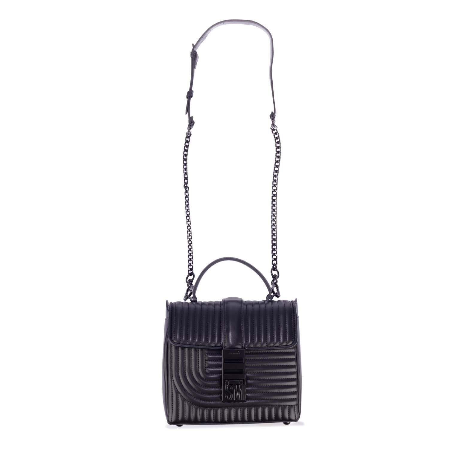 Fold-over flap with a clasp closure. Chain and a removable adjustable faux leather strap. Quilted crossbody bag with a top handle. Synthetic materials with a faux leather composition.