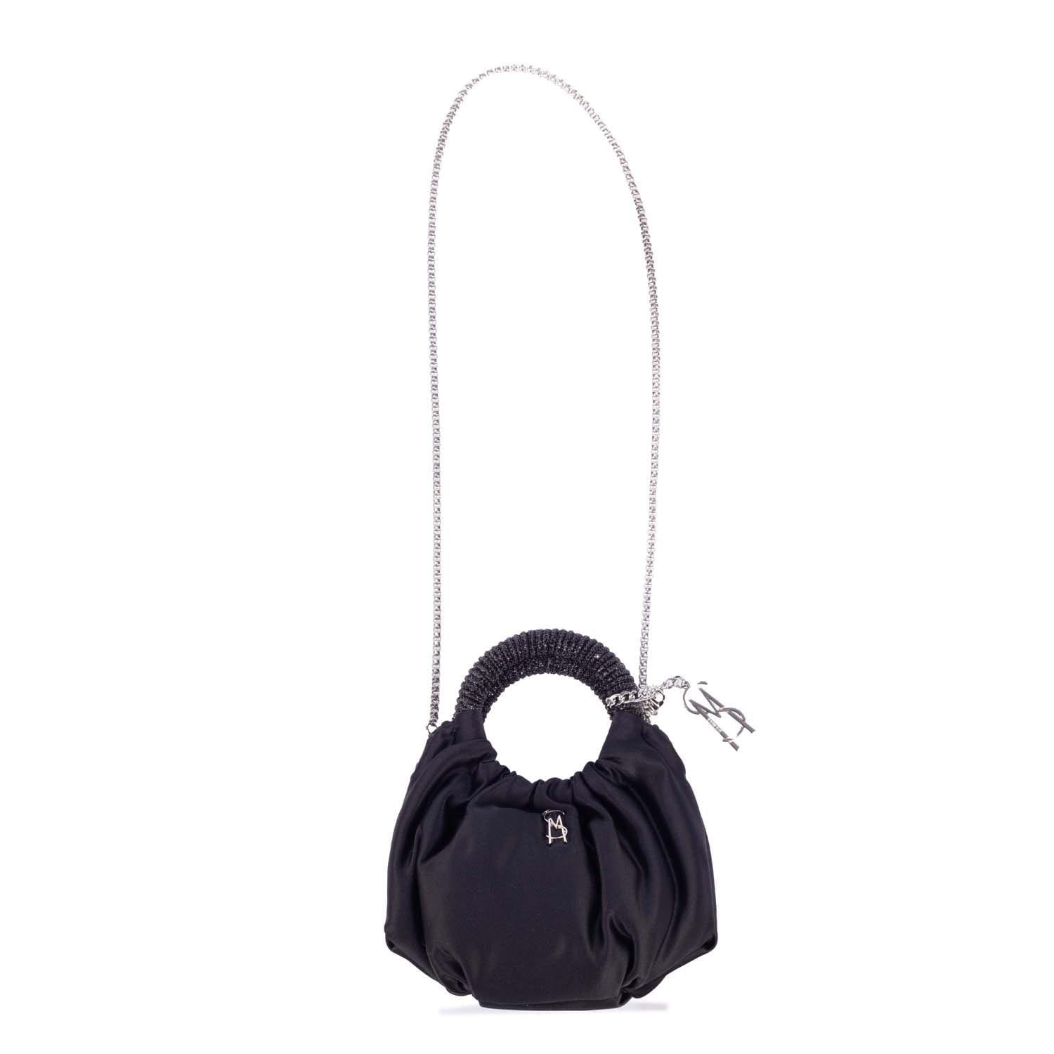 It features a ruched body a rigid circle top handle and a detachable chain crossbody strap.