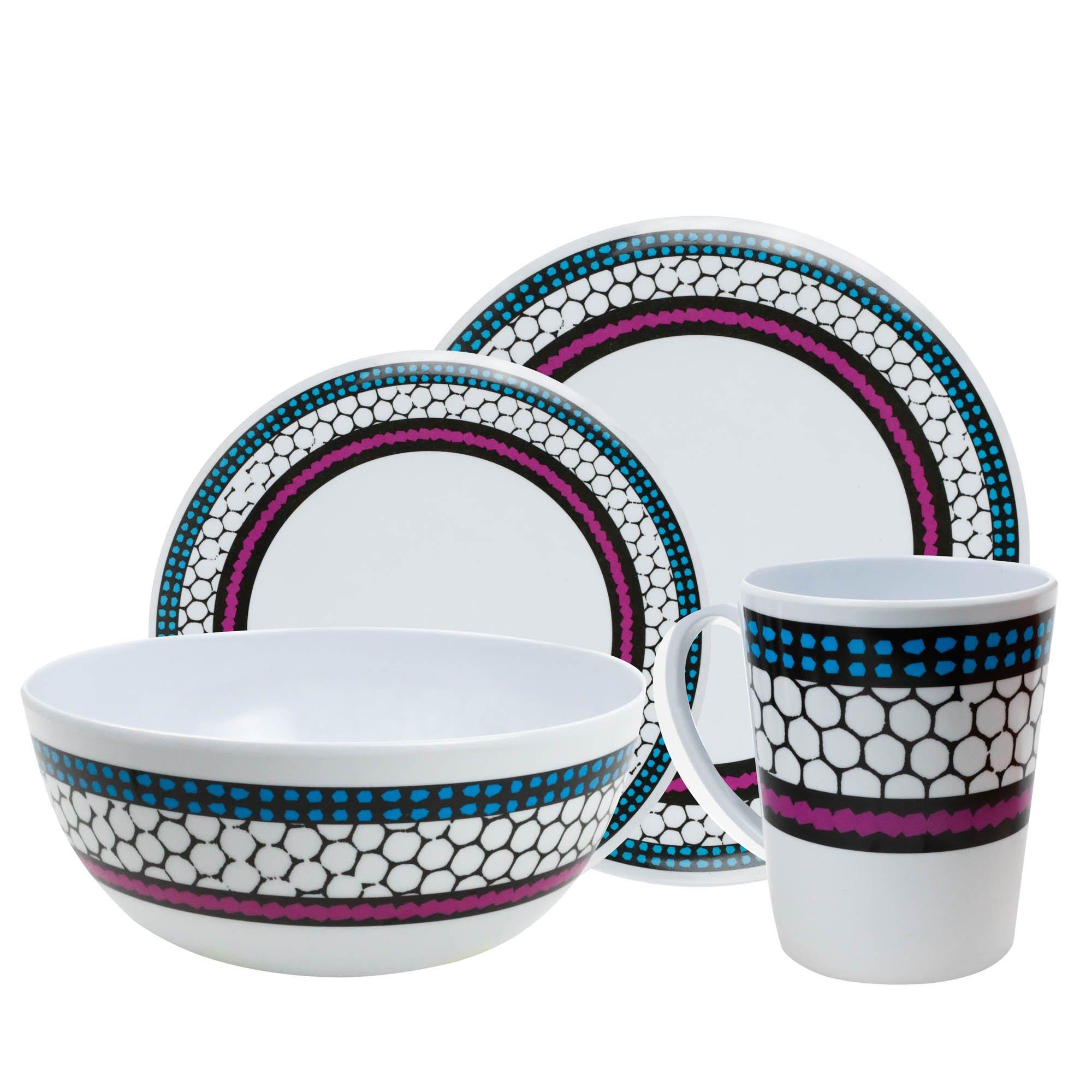 This high-quality and durable tableware is ideal for caravan holiday makers and campers. It is also suitable for al fresco dining. This set is made entirely from melamine, which has the following benefits over traditional crockery. , Made From Melamine: Melamine is significantly lighter in weight and more durable than traditional porcelain crockery. Making it easier for you to transport and store when not in use. , For Home/Outdoor Dining: Perfect for caravan holiday makers, motorhome users, campers, schools, care homes and mobile catering units. Also suitable for use at home and al fresco dining. , Dishwasher-Friendly: This complete dinner set is safe to use in a dishwasher so you can save time when washing up. , Safe Dining Experience: This melamine dinner set stays cool even when hot food is served on it, providing a safer dining experience, especially with children. Set Includes: 4 x Plates 4 x Side Plates 4 x Bowls 4 x Mugs