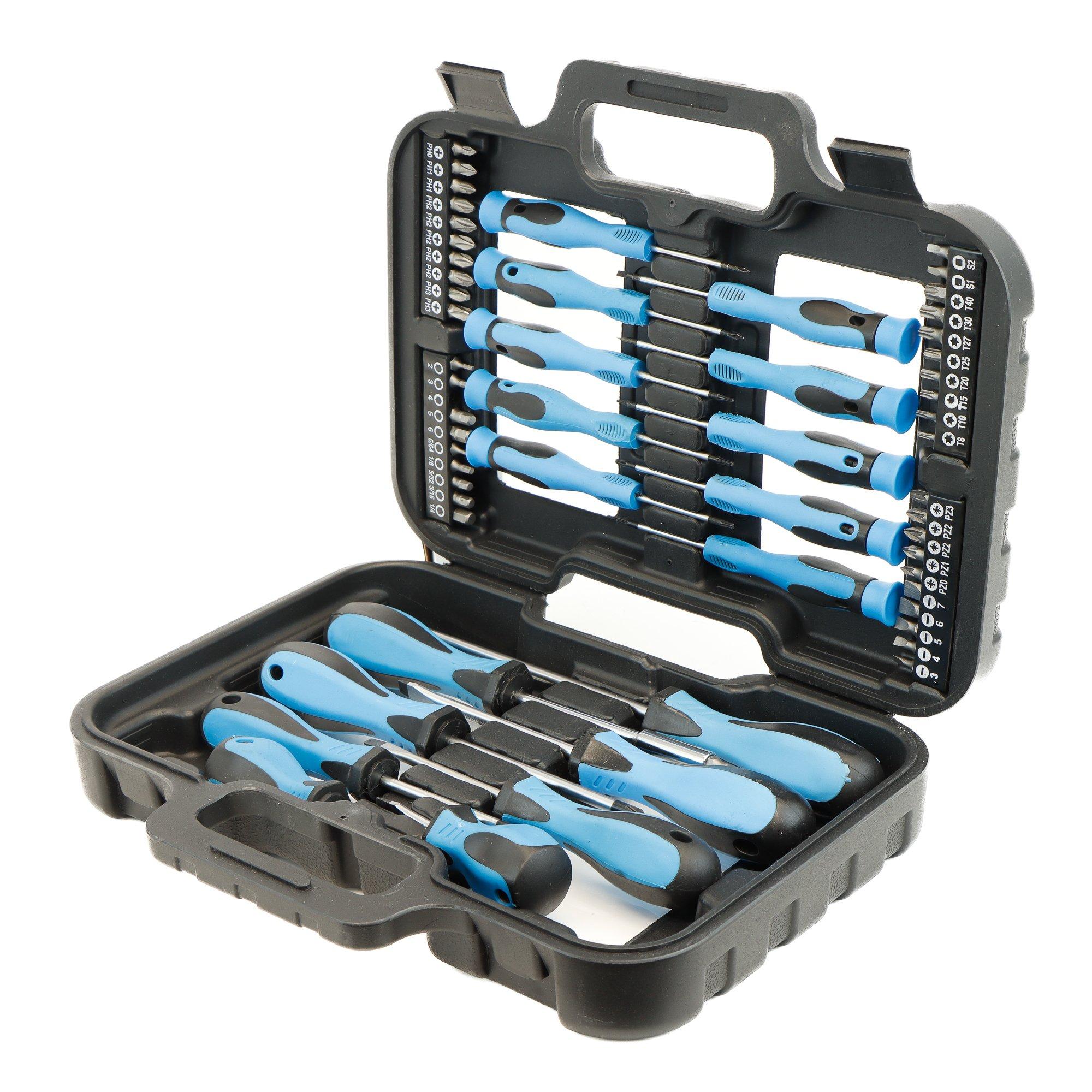This comprehensive screwdriver & bit set from Streetwize is made from chrome vanadium steel, which is a hardened and durable steel. The set is suitable for home and professional use, and the screwdrivers in this set all have a blue soft-grip handle.
