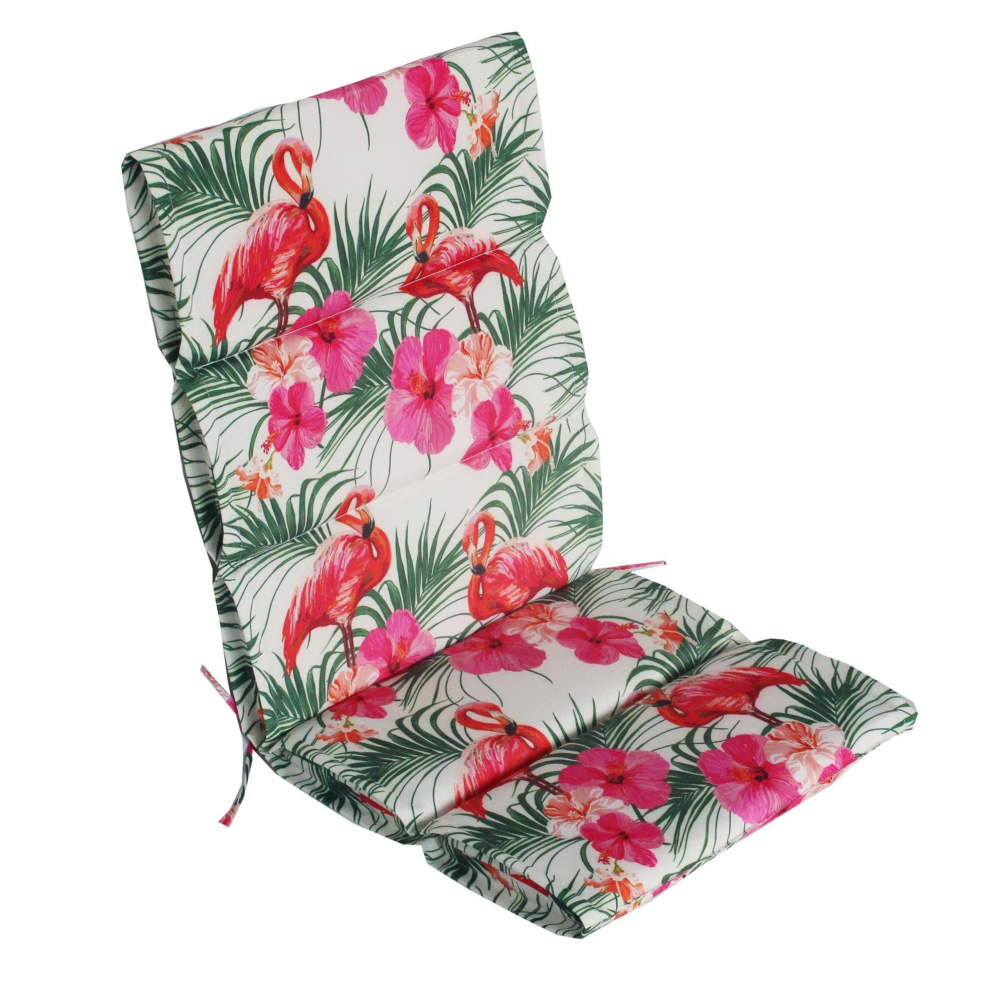 Feature two ties and back belt for securing the cushion to your seat Dimensions: 100cm x 46.5cm x 4cm Flamingo printed design