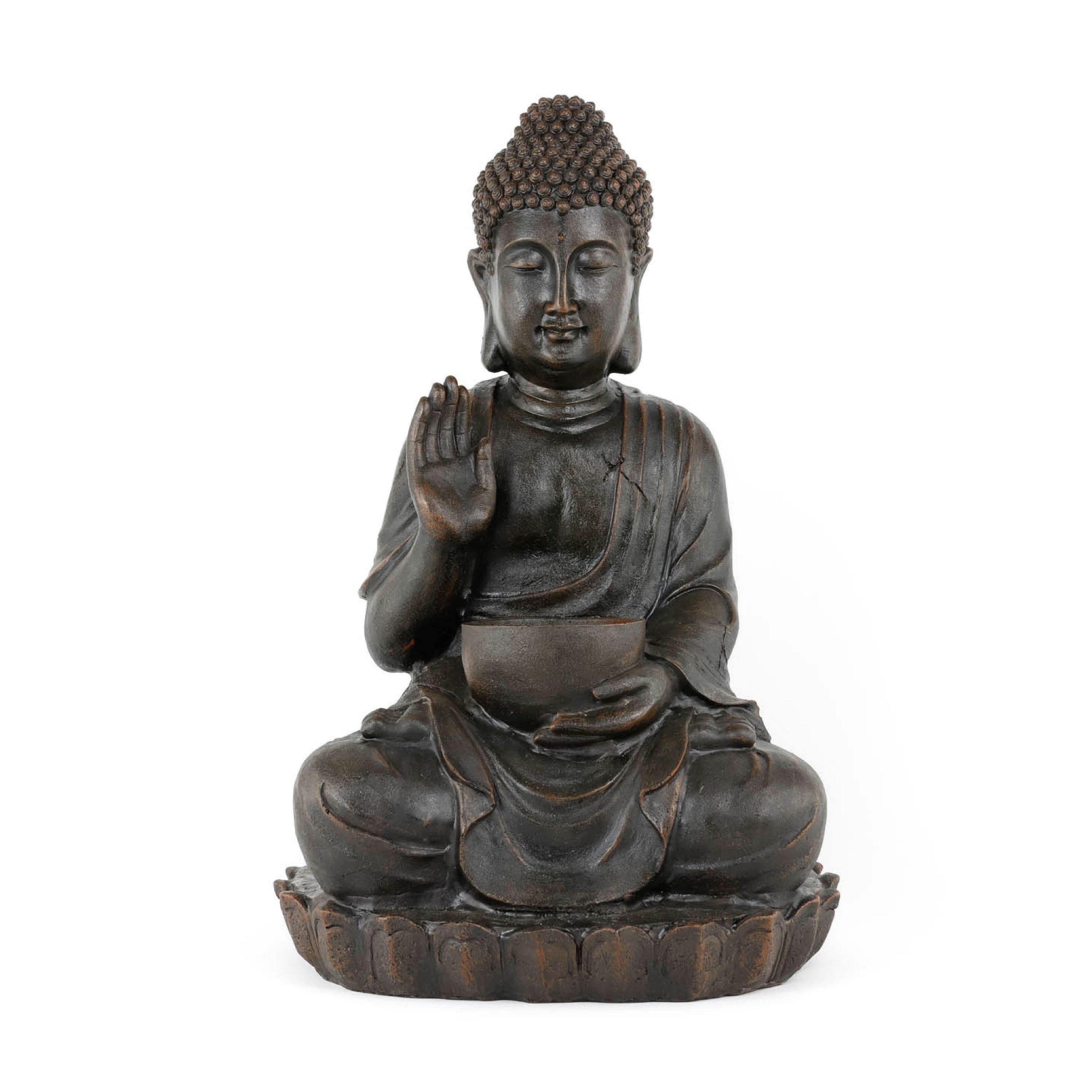 A meditating Buddha with a bowl water feature. Solar energy powers this eco-friendly water feature. It is made from durable, weatherproof poly resin, making it perfect for all-year use. An external solar panel is connected to the water pump at the fountain, which powers the water feature. When this panel is positioned in direct sunlight, it uses solar energy to operate the water pump. The water feature switches off automatically when there is low light or when it becomes dark.