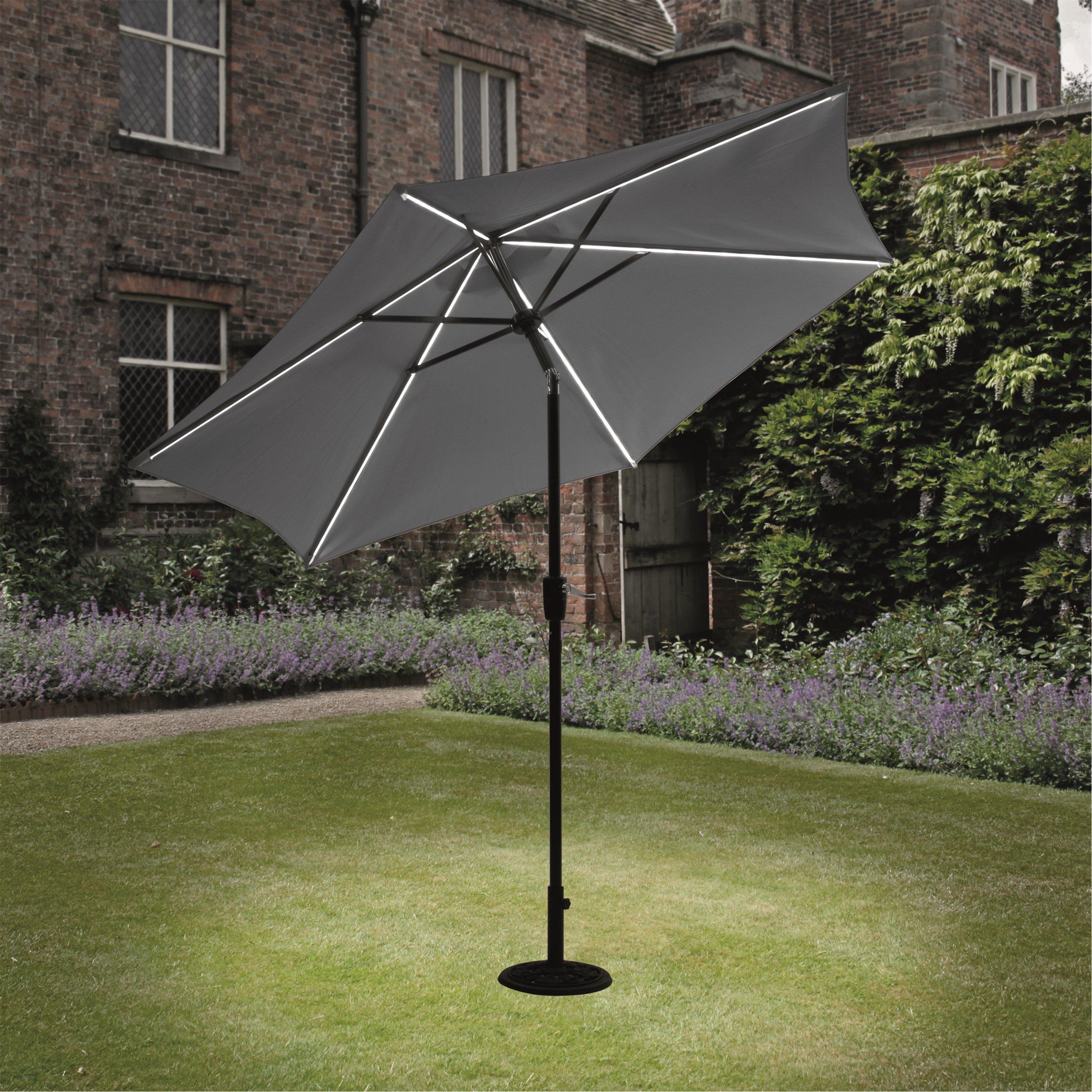 This Garden Parasol will protect you from the sun during the day and illuminate your evening entertaining and your relaxation time in your outdoor space. The parasol measures 2.7 m in diameter with a polyester canopy set on a steel frame. It includes a crank handle for easy opening and closing of the canopy, and a manual tilt to help direct both your daytime shade and evening glow. A strip of LEDs is set along each rib of the parasol and are powered by a solar panel set at the top of the canopy. This parasol is suitable for sunshade and evening illumnination, and will resist light showers only. It should be used with a suitable sized parasol base (not supplied). Available in two colourways, dark grey and ecru.