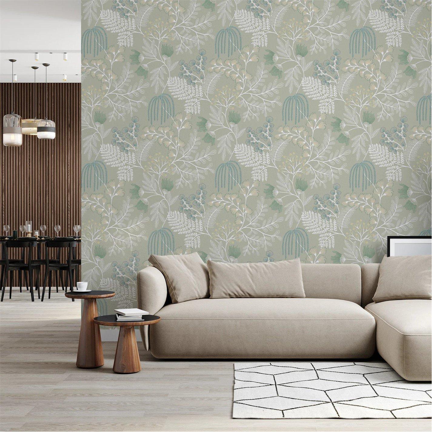 The Richmond wallpaper design blends soft sage green and crisp white with hints of blue, creating a serene and minimalist atmosphere. Featuring delicate, organic motifs with simplistic leaves, all designed with a light, and airy essence highlighting the simplicity of natures beauty. The sage green hues are muted and soft, offering a calming vibe, while the white provides a clean and bright contrast, making these elements pop without overwhelming the space. Use this serene design to create a peaceful and inviting environment in a living room, bedroom, or any space where a touch of understated elegance is desired. Application Method: Quick & easy 'Paste The Wall' application (no decorating table or pre-cutting required) Removal: Strippable in large sections Design style: Trees Design match: Offset match Pattern repeat: 530mm Roll size: 10m X 52cm Eco Friendly 1 roll usually does 3 drops on the wall depending on ceiling height, pattern match and wastage. Same batch guarantee when purchasing multiple rolls at once. Please note the colours on screen may vary from the actual product. Full instructions for hanging are supplied with each item