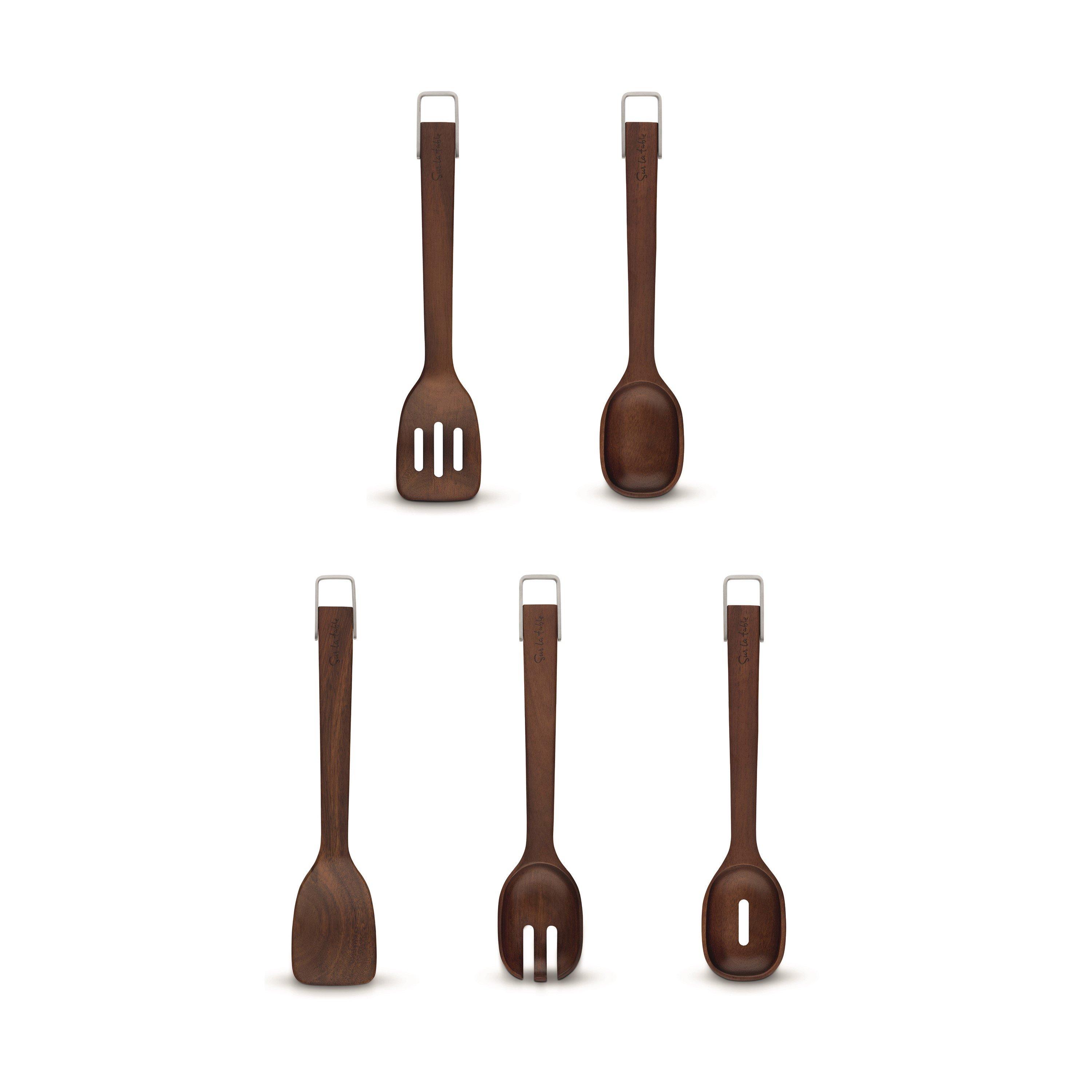 This utensil set features your essential everyday cooking tools, including Solid Turner, Solid Spoon, Slotted Turner, Slotted Spoon, and a Salad Fork. All of the utensils are crafted from strong and durable Acacia wood, a wood with unique qualities that makes them not prone to warping or cracking. It's built to last through years of cooking, so perfect for the busy home. Being made of wood, this prevents scratching, so are perfect for non-stick cookware. These utensils are also resistant to odour and discolouring, making cooking safer, more hygienic and long-lasting for years of intense use. Its natural colour, paired with a modern striped pattern and textured finish, brings a touch of style to any kitchen dcor. We also know the importance of eco-friendlier living. Our utensils don't just look great, they have been made exclusively from responsibly sourced materials to make your kitchen collection more sustainable.