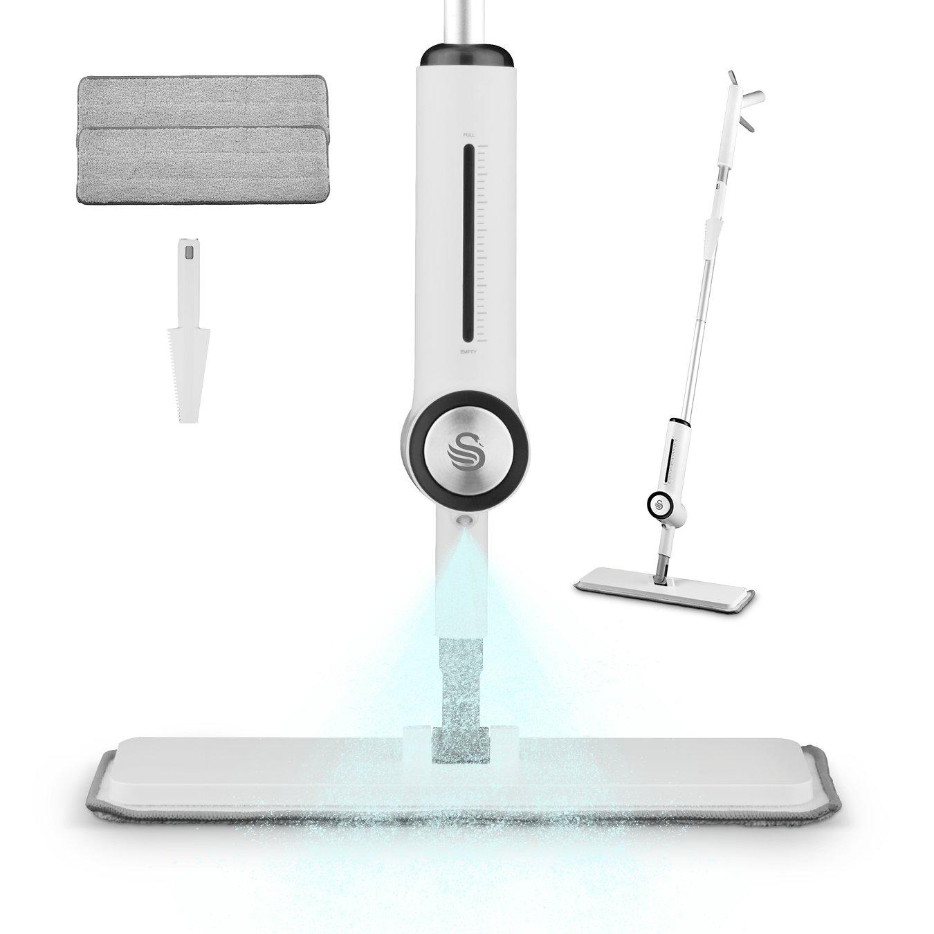 Elevate your cleaning experience with this stylish 2-in-1 spray mop from the new Swan Elevate range, which is twice as fast as traditional mopping. With no bucket needed, grab your mop, press the trigger, and start cleaning. From muddy prints to general spillages, your floors will be spotless. The flat mop head features 180 degree pivoting neck, making quick work of spills, easily reaching corners and covering larger areas on a range of hard floor types. The premium machine washable microfibre pad effortlessly lifts dust and debris. Our floor spray mop has been ergonomically designed to be lightweight, ensuring your hand doesn't tire, while keeping you from bending down. It's easy to refill the anti-leak bottle with any cleaning solution-homemade or store-bought. Includes an additional cleaning tool to remove debris and hair from the mop. When it's time to replace with the spare mop head, simply pull it off and push the new one on. Keep your floors looking pristine, no batteries needed.
