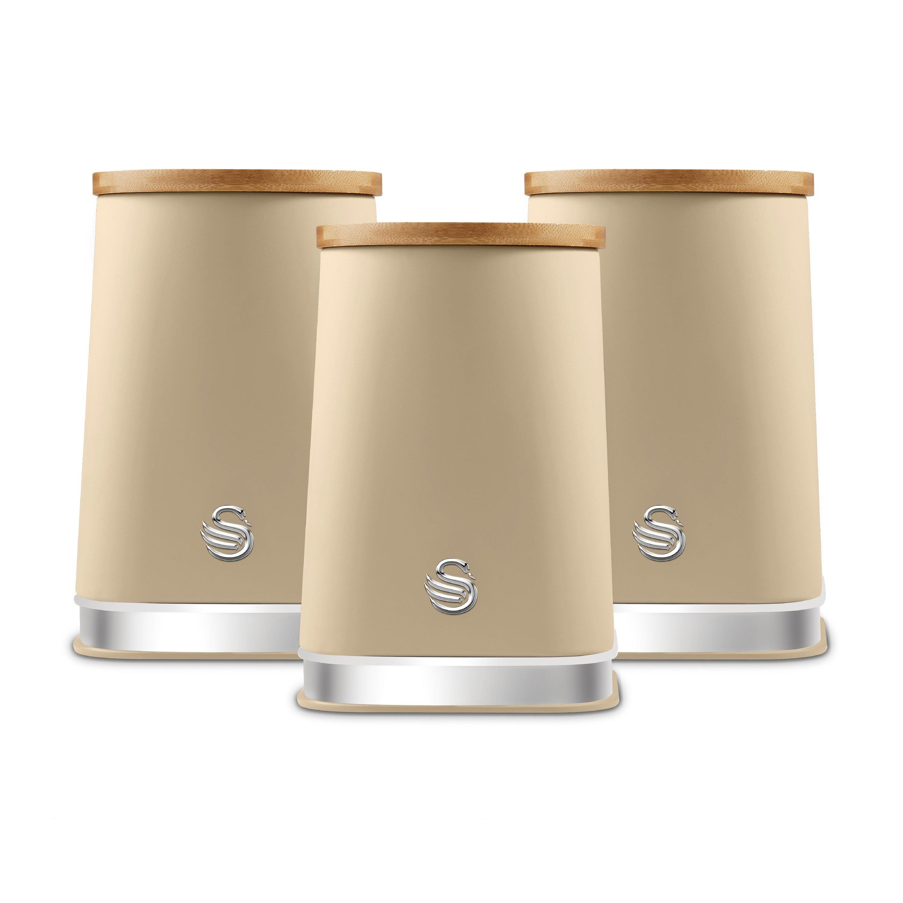 Introduce the Swan Nordic SWKA18524OAT set of 3 oatmeal storage canisters to your kitchen collection. Neatly store your tea, coffee, sugar or other loose ingredients for easy access on your worktop, while protecting them from dust and moisture. It features a removable Acacia wood lid, giving you instant and easy access to your baked goods, with a robust iron design providing durability for everyday use. Requires just a wipe with a damp cloth to clean. Swan Nordic is inspired by Scandinavian minimalist design.