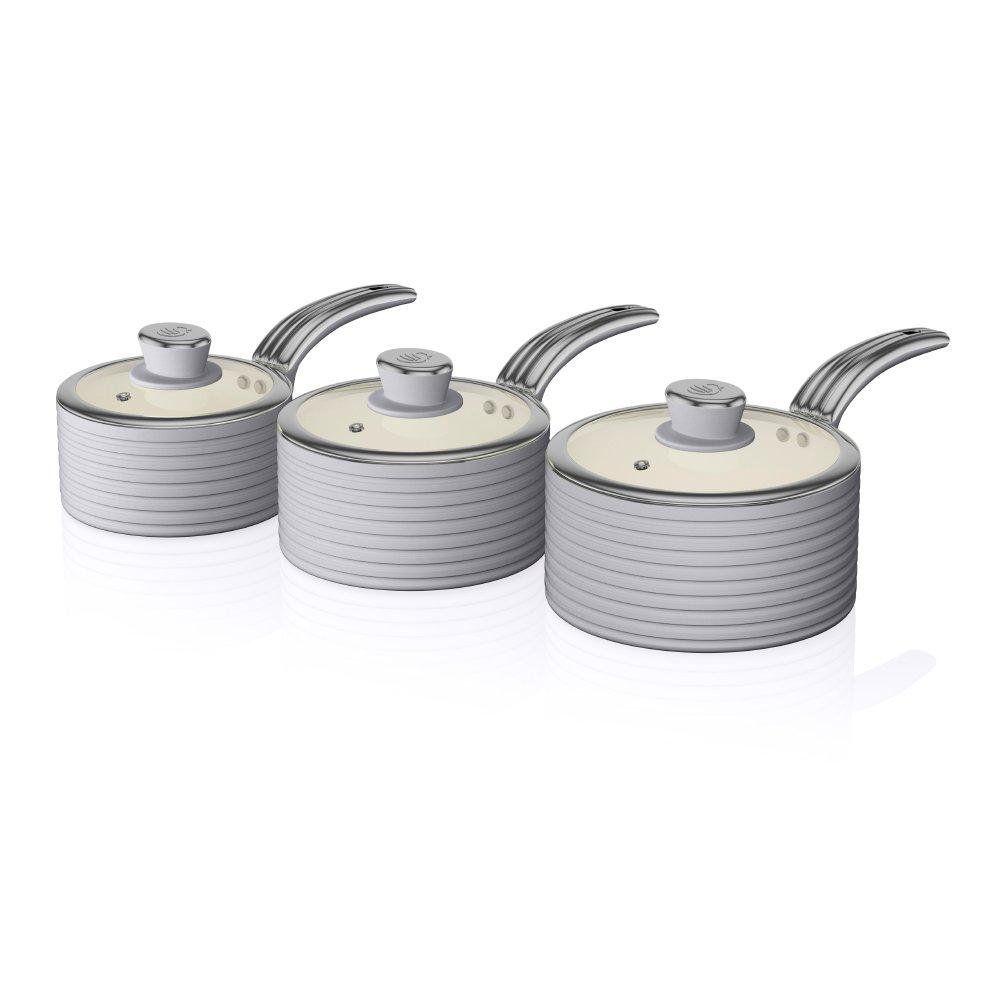Create delicious home cooked meals for one or all the family with the Retro 3 Piece Saucepan Set. Comprising of 16, 18 and 20cm saucepans, this set is perfect for boiling pasta, potatoes and vegetables with ease, making it perfect for one or all the family. Featuring an ivory ceramic non-stick inner coating, each saucepan requires little to no oil, enabling a healthier cook and an easier clean. Constructed from 3mm thick pressed aluminium, each saucepan is built to stand the test of time whilst Bakelite soft touch stay-cool handles offer comfort and control during use. Suitable for all hob types including induction, each saucepan requires only a simple hand wash to maintain its optimum performance. Complete with glass lids featuring a stylish Swan embossed handle and beautiful rib designed body, this Retro 3 Piece Saucepan Set makes both a practical and stylish addition to your kitchen.