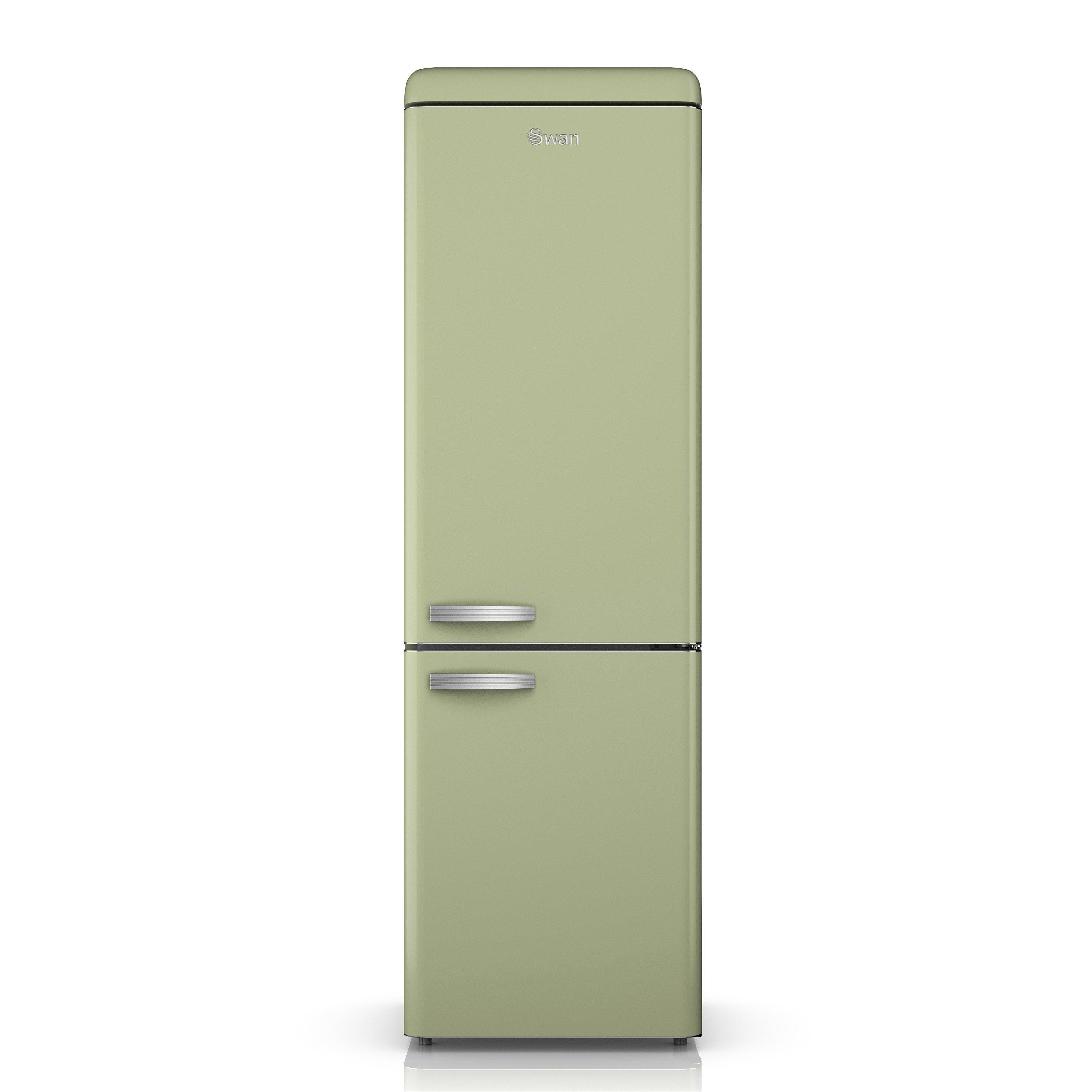 The Swan Retro 70/30 Fridge Freezer combines style and practicality ideal for busy homes. It features a 211-litre fridge and 93-litre freezer, along with 4 glass shelves, 1 chrome wine rack, 3 freezer drawers and a salad crisper for organised storage. Despite its large capacity, this compact fridge freezer fits into various spaces, from kitchens to offices. It has an E energy rating, making it economical and eco-friendly without compromising on performance. The stylish soft green exterior adds retro elegance that looks great in any decor. Available in trendy retro shades, it seamlessly integrates into any colour scheme. Perfect for students, newlyweds, or anyone looking to enhance their kitchen with a touch of vintage charm.