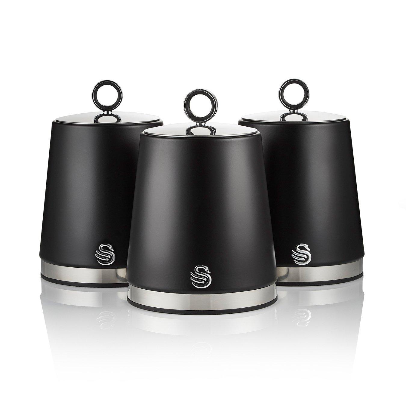 Introduce the Swan Serenity SWKA18536BLK set of 3 black storage canisters to your everyday kitchen collection. Each canister features a 1.3 litre capacity, letting you store large amounts of tea, coffee, sugar or other loose ingredients on your kitchen worktop, all while protecting the contents from dust or moisture. The lids include large sturdy steel loops to grip comfortably, providing you with easy access to the contents. These kitchen canisters combine practicality with an elegant design, offering a contemporary colour scheme to fit perfectly amongst any kitchen decor. All canisters have non-slip feet for added stability and to protect your worktop from scratches. The canisters form part of the Swan Serenity breakfast and storage collection. Swan has been providing high-quality household appliances and kitchenware to millions of homes across the UK for over 100 years.