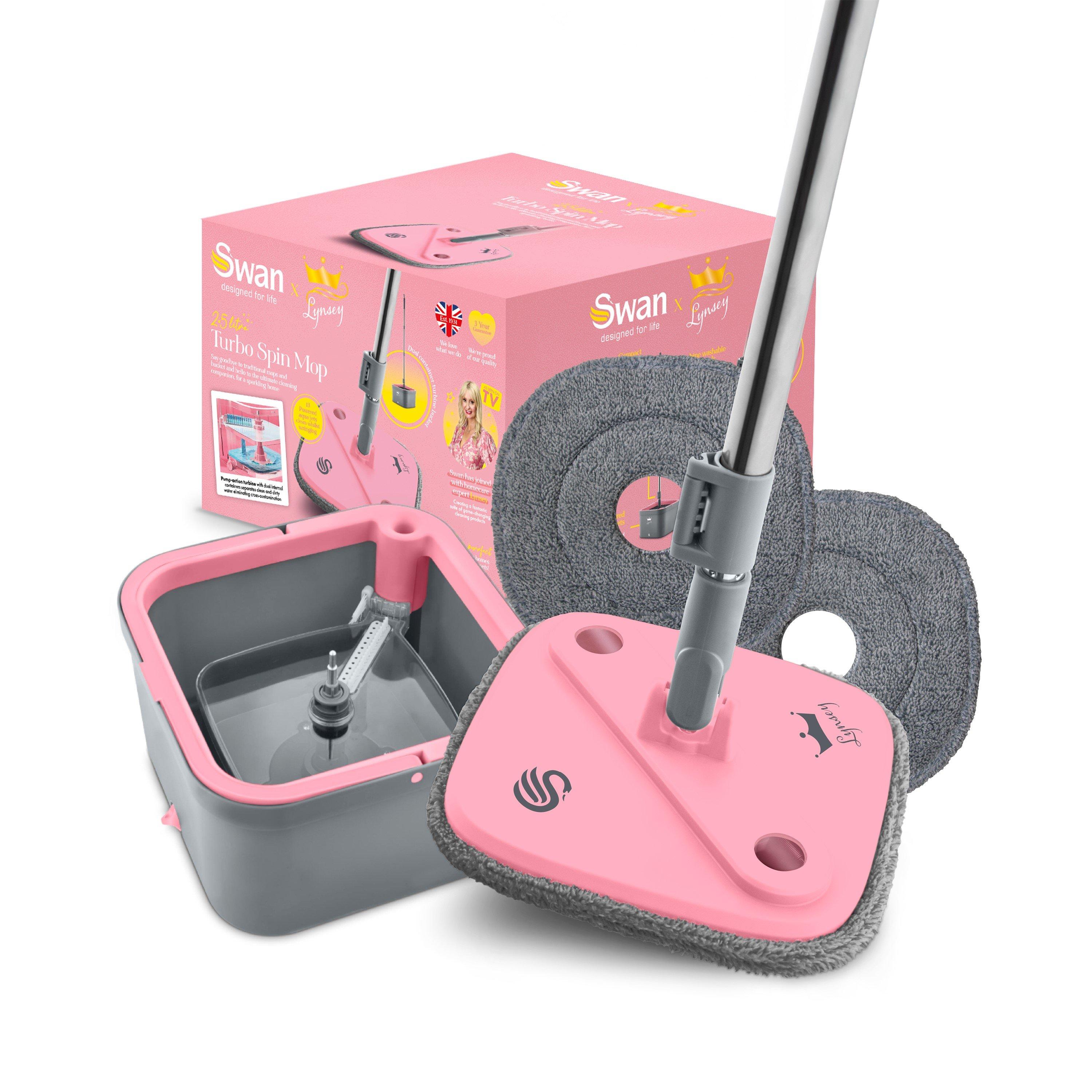 The Swan x Lynsey SWFC1002QOCN pink and grey lightweight turbo spin mop is your one-stop mop to make your floors sparkle. It features two water tanks, which separates dirty and clean water in the bucket to prevent cross contamination. The multi-surface microfibre pad captures dirt rather than pushing it around for more effective cleaning. Using 13 high powered aqua jets and 360 spin cycle, the mop head fibres get agitated by the dual bristle brushes, forcing dirty water out and pushing clean water in, so you always have clean water. Two indicators let you know when it's wrung and ready to use. It cleans a range of floors or surfaces, including shower screens, bathroom tiles, windows, garage doors, garden furniture, wheelie bins and more. Drain dirty water from the drainer plug and add clean water in a separate hole for on the go filling. The handle is collapsible for space-saving storage. Machine washable head, with spare head included. That's why it has TV's Queen of Clean crowning stamp of approval.