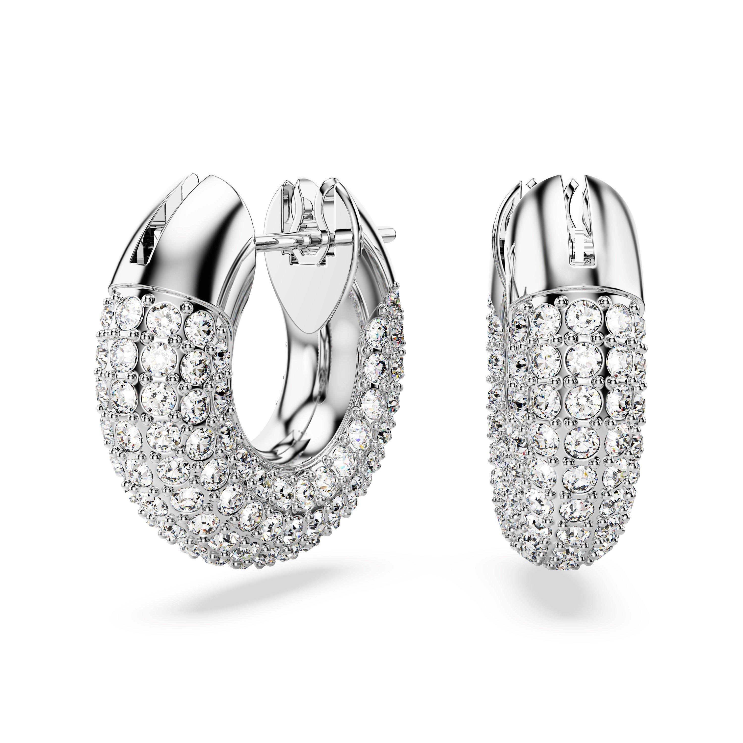 A modern spin on classic hoop earrings, this genderless pair will lend a dynamic touch to any outfit. Its sculptural design celebrates Swarovski's iconic pavé technique with glittering foiled crystals set against a rhodium plated frame. Not just for daytime, wear this statement duo with after-dark looks, too. These earrings are part of the Dextera family, designed by Creative Director Giovanna Engelbert for Collection II.
