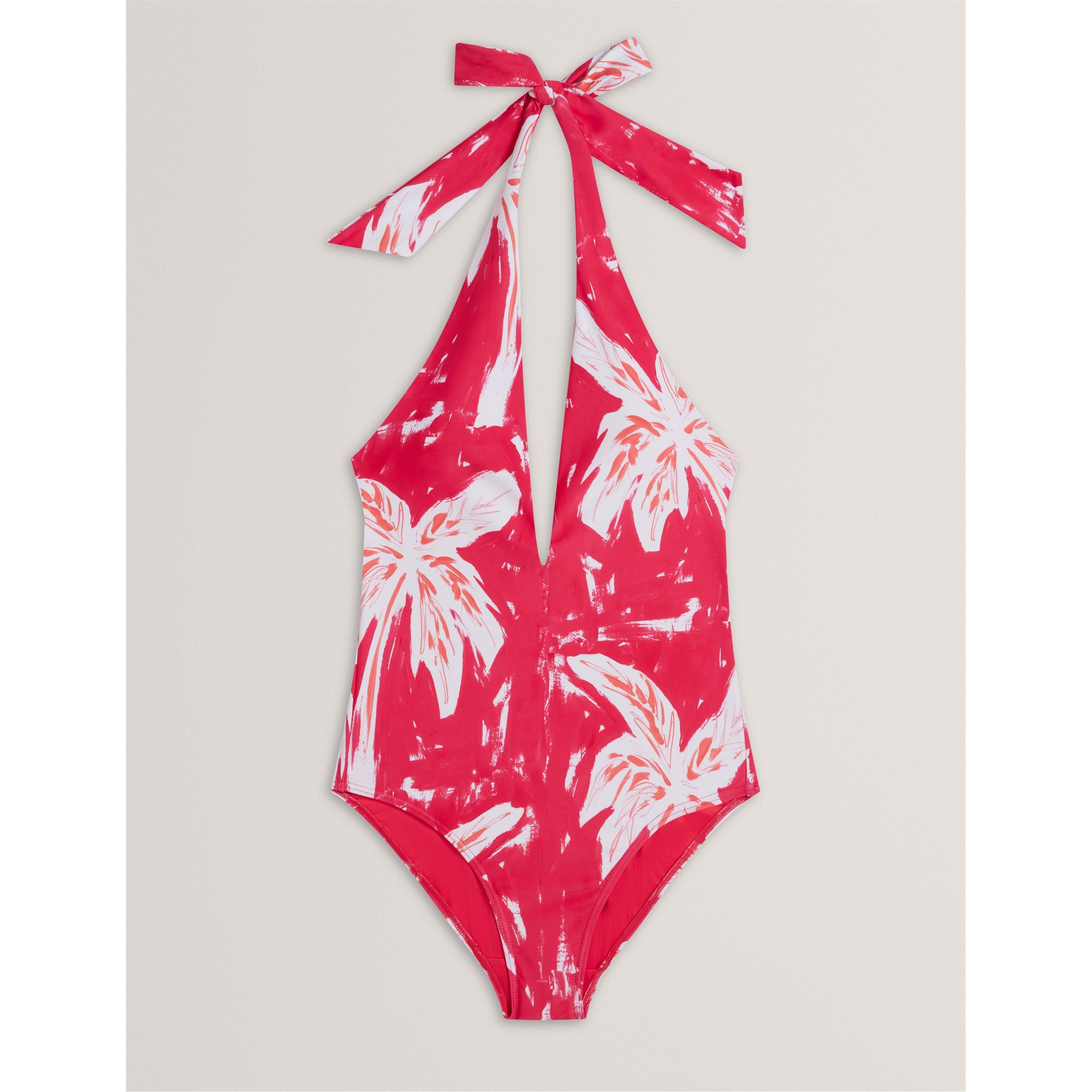 Ted Baker's Print Plunge Swimsuit features a low-cut, deep plunge neckline and printed design. This designer swimwear piece pairs the flattering cut with contemporary fashion style in a one-piece shape.