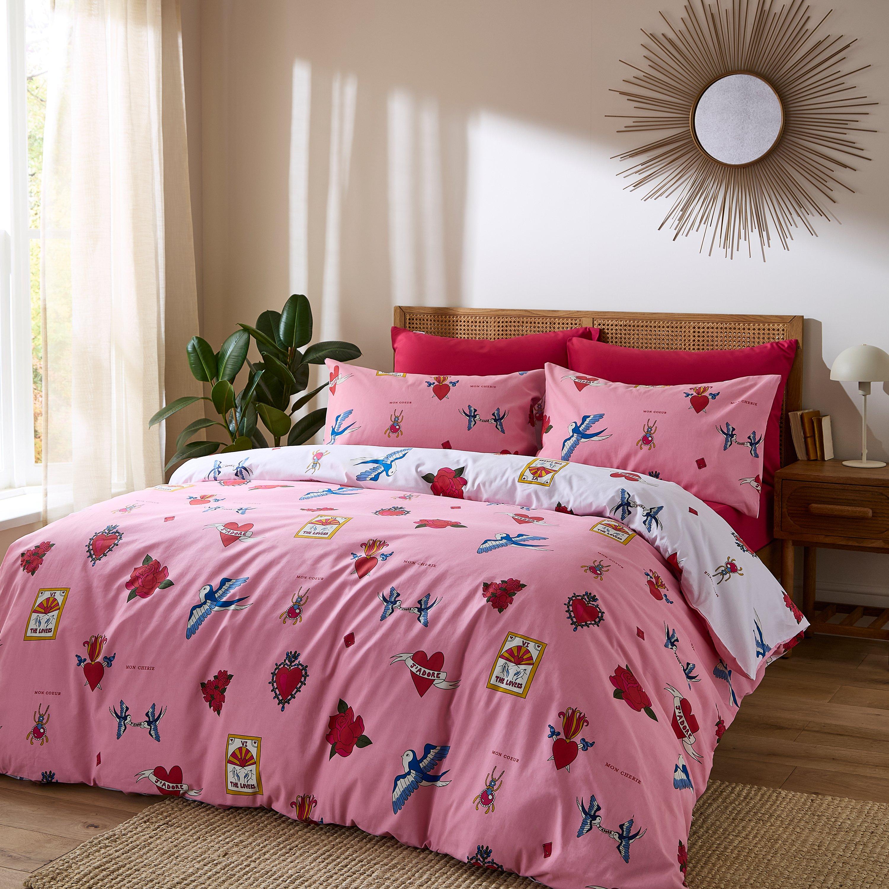 Add a touch of vintage romance to your bedroom with our charming tattoo-inspired bedlinen set. The soft pink front is adorned with classic motifs of swallows, roses, and hearts, bringing a nostalgic yet playful feel to your space. The bright white reverse offers a fresh take with the contrasting beautifully detailed design, providing two stylish looks in one. Crafted from 100% cotton, this bedlinen set is beautifully soft, breathable, and gentle on your skin, keeping you cool and comfortable all night long.