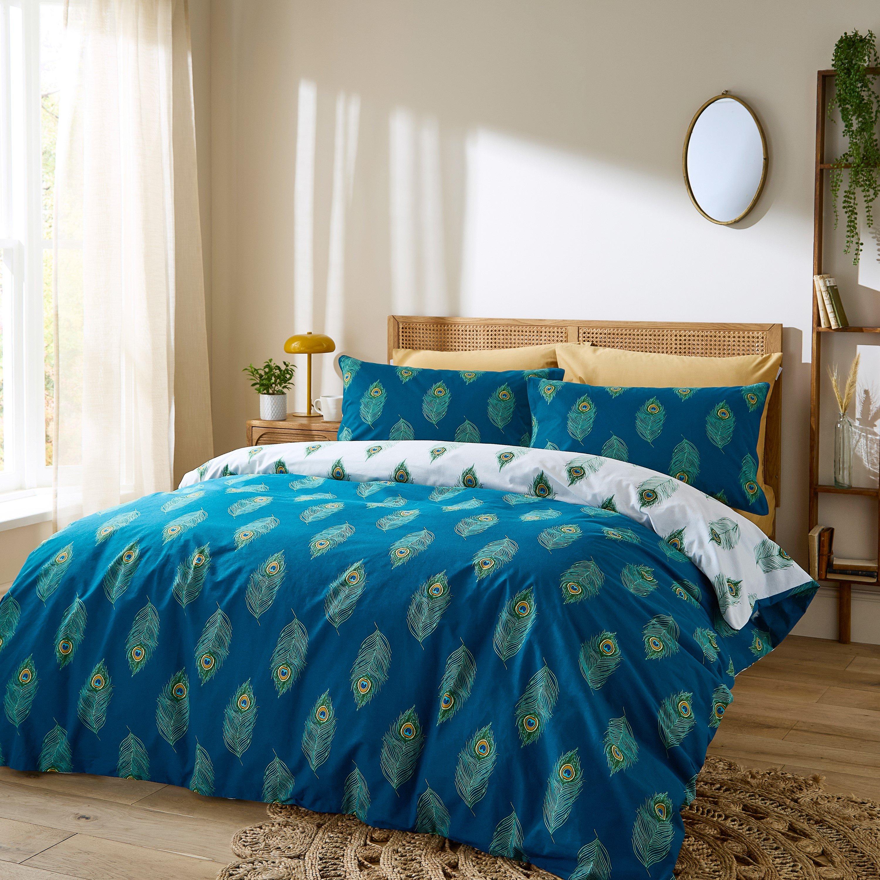 Drift off into a world of elegance with this peacock feather bedlinen set, designed to bring a touch of timeless charm to your bedroom. The rich teal front, adorned with intricate feather motifs, creates a sense of opulence, while the clean white reverse with delicate feather detailing offers a fresh and versatile look. Crafted from 100% cotton, this bedlinen set is beautifully soft, breathable, and gentle on your skin, keeping you cool and comfortable all night long.