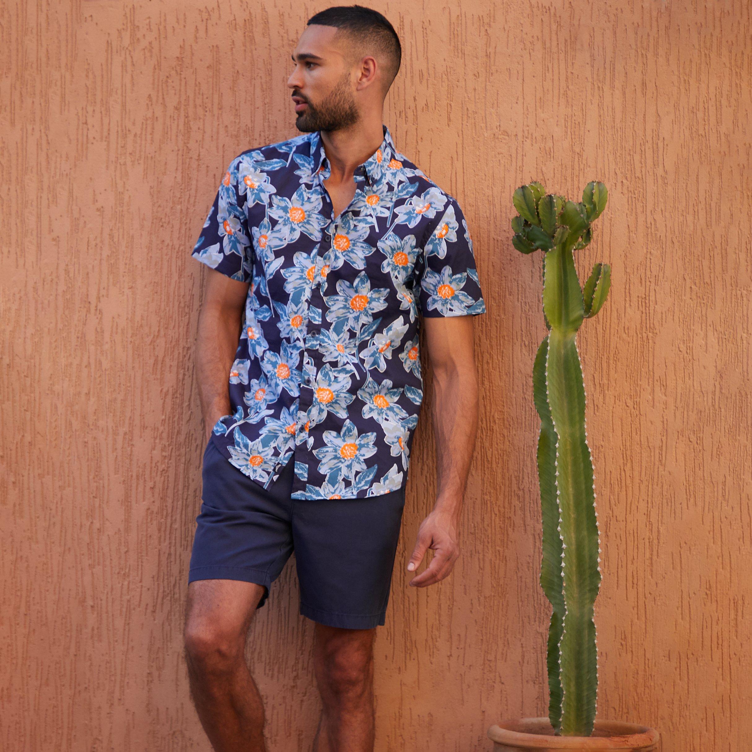 This short sleeved tropical print shirt from Threadbare features an all-over floral print and a button-down collar. The lightweight cotton fabric is ideal for keeping cool. Team with shorts or jeans for a fun, casual look.