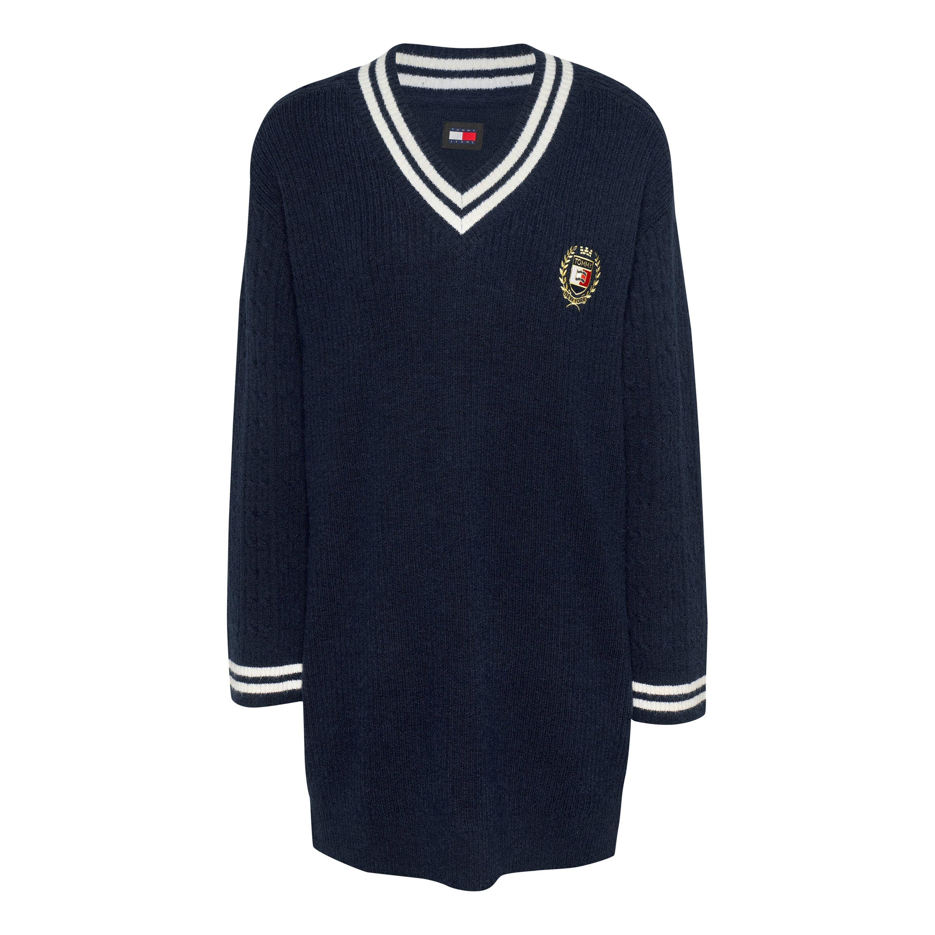 Tommy Jeans’ Crest Sweater Jumper Dress combines elegance and comfort with its soft fabric and flattering V-neck design. The ribbed trims add texture and sophistication, while the long sleeves provide warmth and style, it’s perfect for colder days. Ideal for a cozy yet chic brunch, a day at the office, or an evening out.