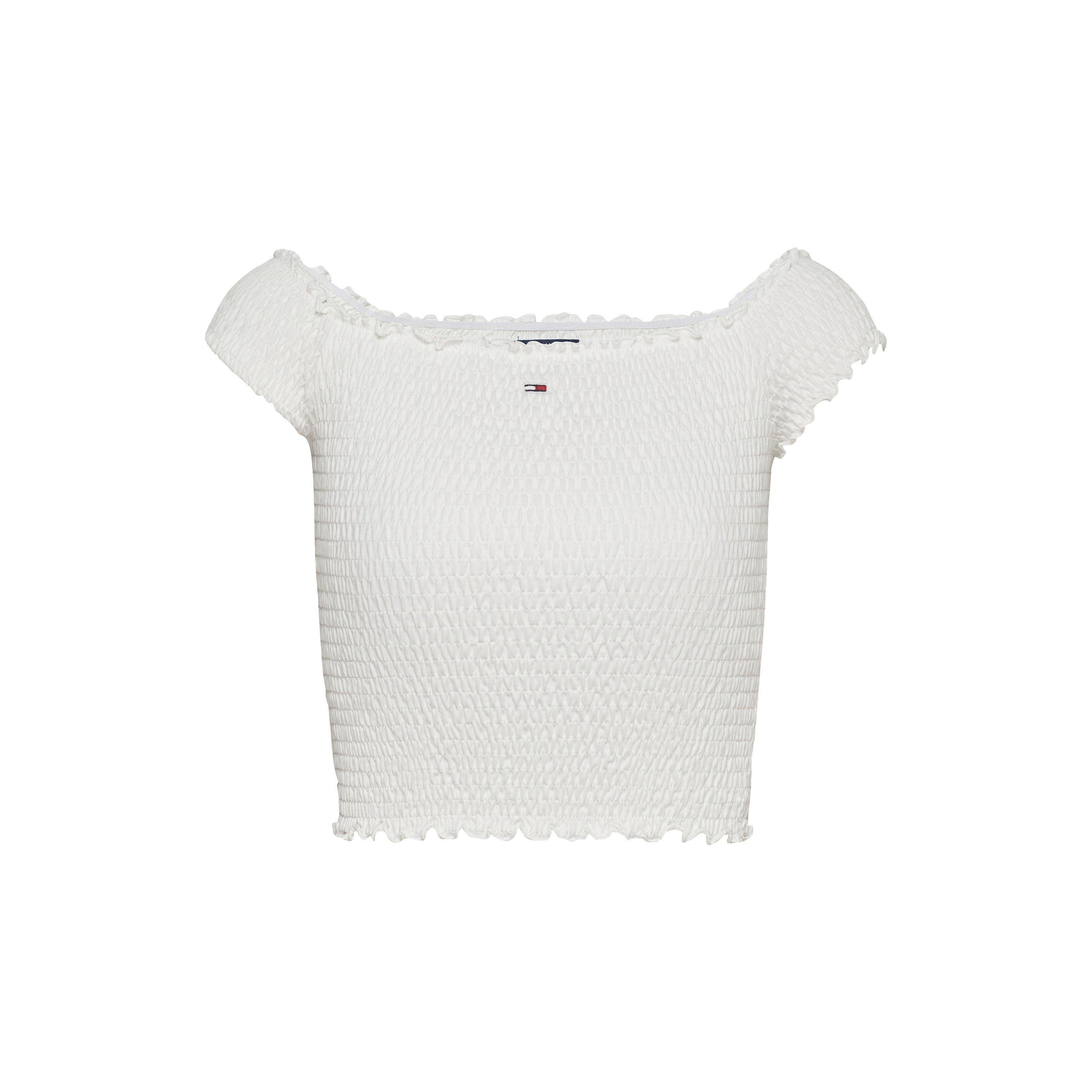 The Tommy Jeans Smock Lightweight Crop Top has gathered fabric that creates shape through the body. The cropped length sits above the waist with a relaxed profile.