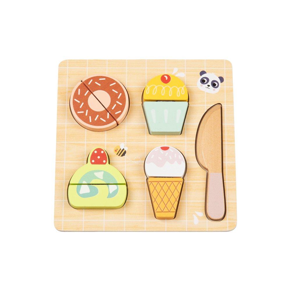 - This wooden dessert-themed cutting puzzle brings imaginative play and hands-on learning together. Featuring four delicious-looking treats—donut, cupcake, ice cream, and cake—kids can slice them with a wooden knife and reassemble the pieces, enhancing their fine motor skills and creativity.