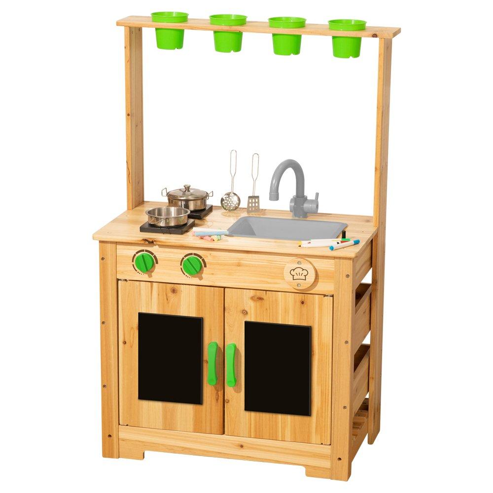 - This deluxe wooden mud kitchen features a lifelike setup with a faucet, sink, stovetop,chalkboard doors and an acrylic board on the back to be drawn on with the pen markers—perfect for pretend play in the garden or backyard.