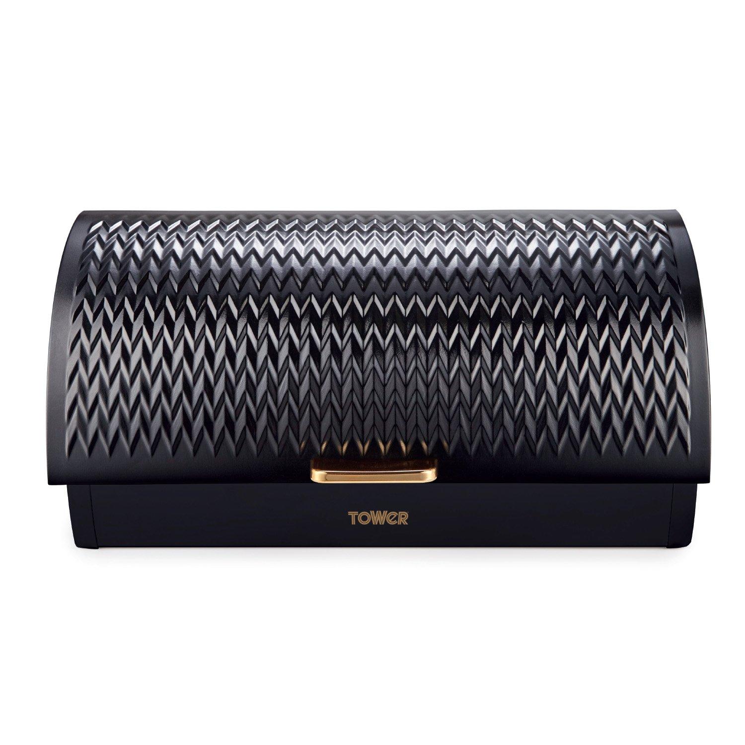 Tidily store your baked produce away within the durable structure of this bread bin. Supporting a rolltop lid to grant access to the contents inside, the quality stainless steel material features a black coated V shaped texturing to the roll top lid to add a splash of style across your kitchen side. The large capacity provides plenty of storage space to easily fit a variety of sized loaves, bagels, crumpets and muffins, complete with ventilation holes across the main body so your perishables remain fresher for a longer period of time. The durable metal design is also easy to clean, requiring just a simple wipe down with a damp cloth to maintain. This bread bin forms part of a wider empire kitchen collection which includes a range of essential kitchen and other domestic products, featuring canisters and a mug tree and towel pole set.