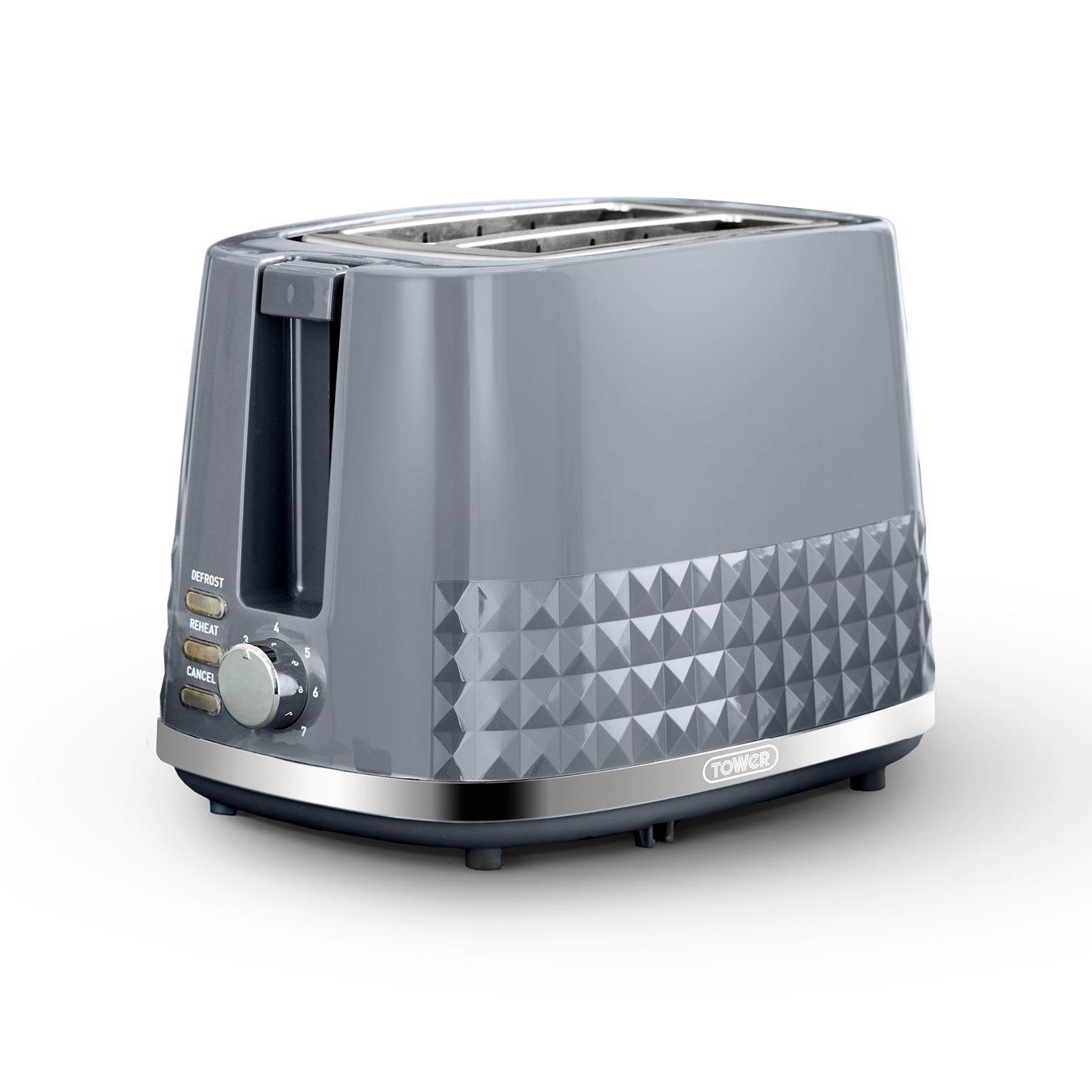 Elevate your kitchen aesthetic with the elegant Tower Solitaire 2-slice toaster. Embossed in a 3D diamond pattern decoration, the Solitaire collection elevates modern design in the home. Choose from 7 browning settings to create toast with the perfect texture and taste, whilst defrost, reheat and cancel functions will let you cook bread from frozen in a hurry or reheat forgotten slices for convenience. The crumb tray can be easily removed to protect your worktop from mess, whilst the self centring function will keep bread secure in the toaster without jamming. Simple cord storage under the toaster will keep your worktop free from clutter.