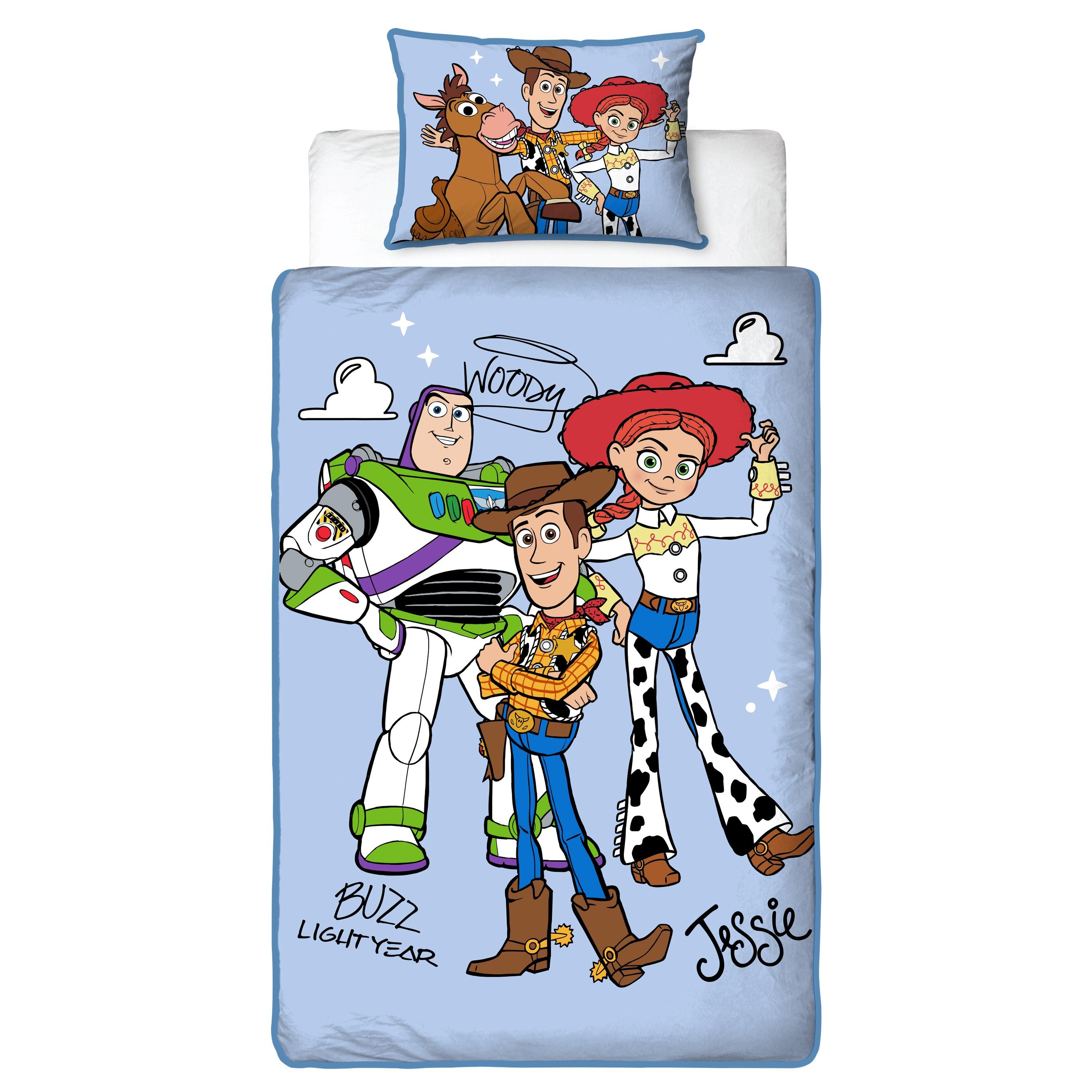 Toy Story brings the magic of Disney and Pixar to life, with the adventures of Woody and Buzz Lightyear delighting families for years. This officially licensed Toy Story bedding set is designed for single beds and includes a reversible duvet cover and pillowcase, so you can easily freshen up the look of your child’s bedroom. The front side of the duvet cover features Woody, Buzz Lightyear and Jesse on a blue background. The reverse side features a repeating pattern of Buzz, Woody, Jesse and the toy aliens on a white background, with the pattern running on to one side of the pillowcase. The duvet cover and pillowcase are surrounded by blue piping trim. The bedding is made from recycled polycotton (52% cotton), and printed to a high standard. The duvet cover has popper fasteners so it’s easy to remove to wash and remake afterwards. The duvet cover and pillowcase are machine washable, and tumble dryer safe at a low temperature. Designed for single beds, this Toy Story duvet cover measures 135 x 200cm, and the pillowcase is a standard UK size of 74 x 48cm