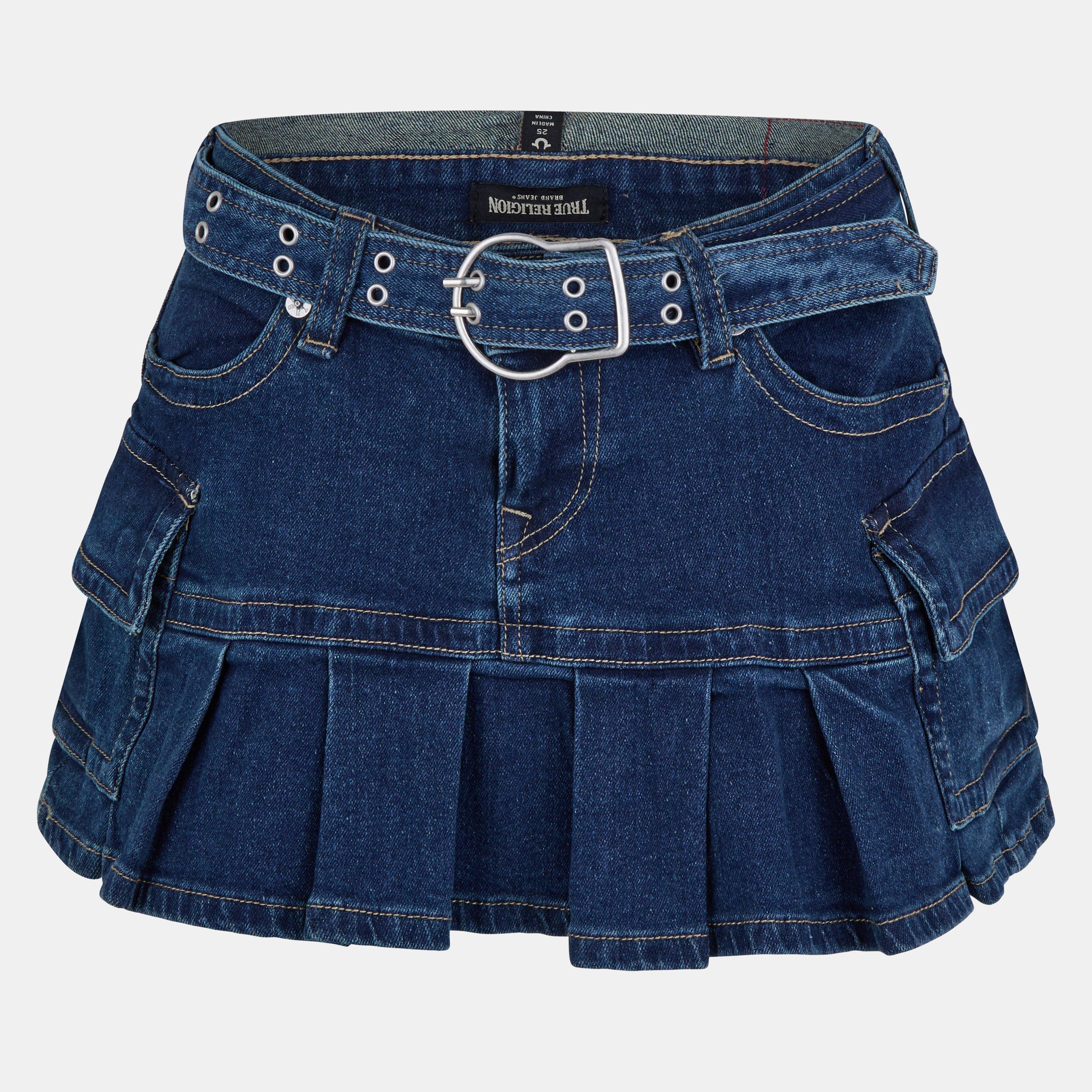 True Religion's Belted Cargo Denim Skirt fuses utilitarian details with classic design for contemporary style. Functional pockets and an integrated belt create a look that stands out with its cargo aesthetic.