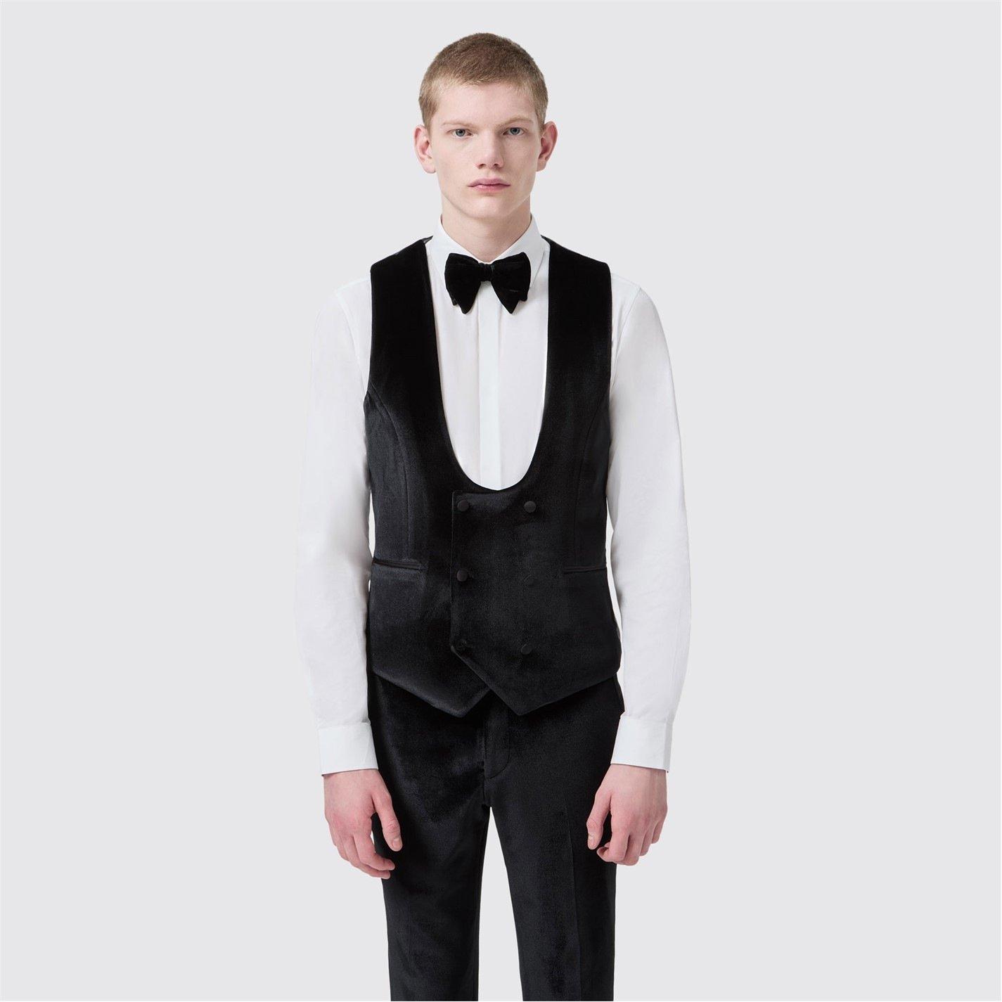 The Sylvester double breasted waistcoat is the perfect plus one to your tuxedo jacket and trousers. Cut to our SLIM FIT and from soft-touch black velvet, this horseshoe waistcoat is a key player in your formal wardrobe.