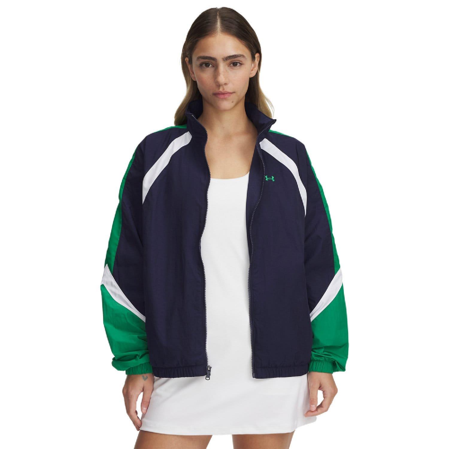 UA Storm technology repels water without sacrificing breathability Woven fabric with all-over crinkle texture is lightweight & durable Open hand pockets Encased elastic cuffs & bottom hem for a secure fit Main body fabric contains at least 90% recycled polyester excluding trims & embellishments