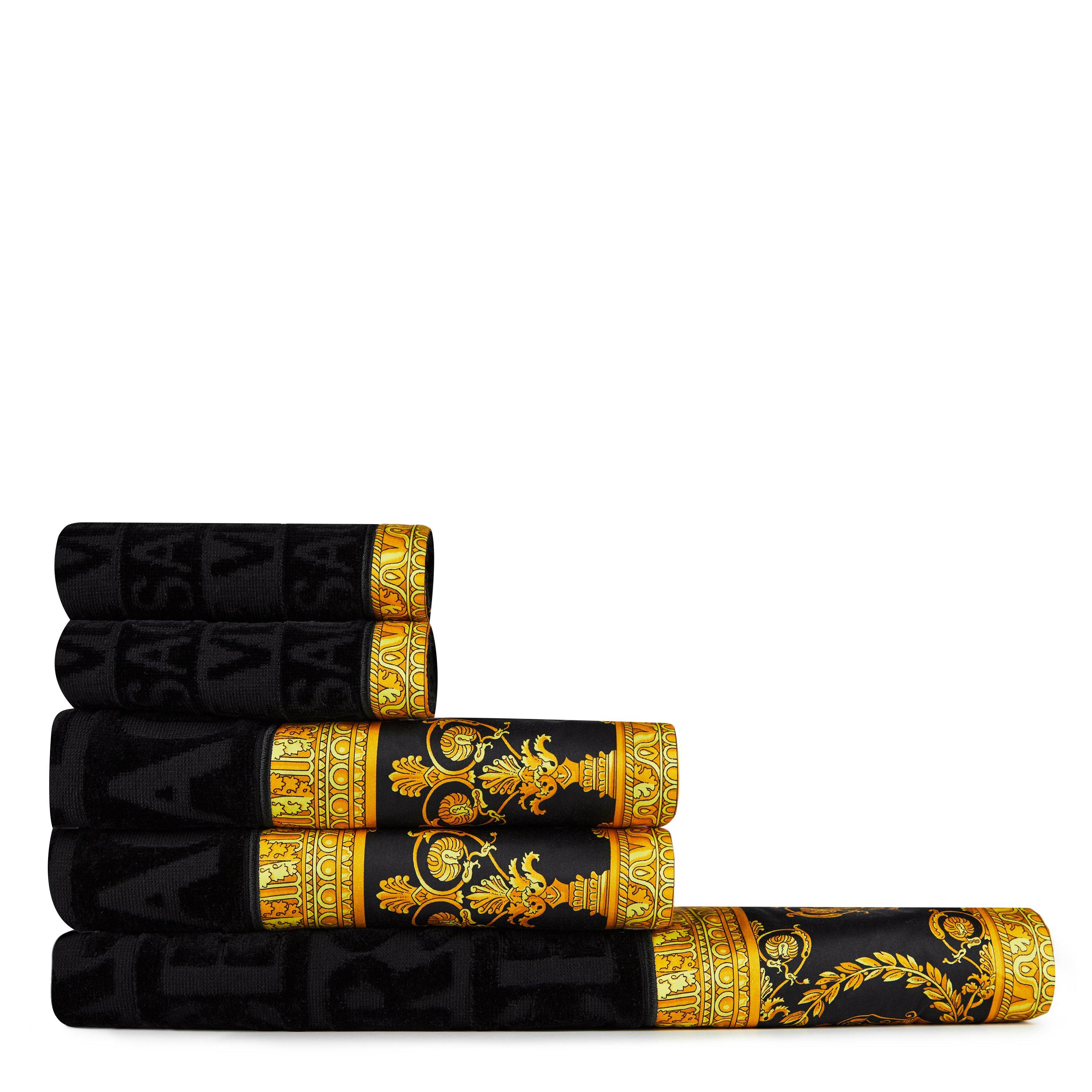 Elevate your bathroom accessories with this sumptuous five-piece cotton towelling set showcasing Versace’s I Love Baroque print and Medusa motif, including a large bath towel, two hand towels and two small towels.