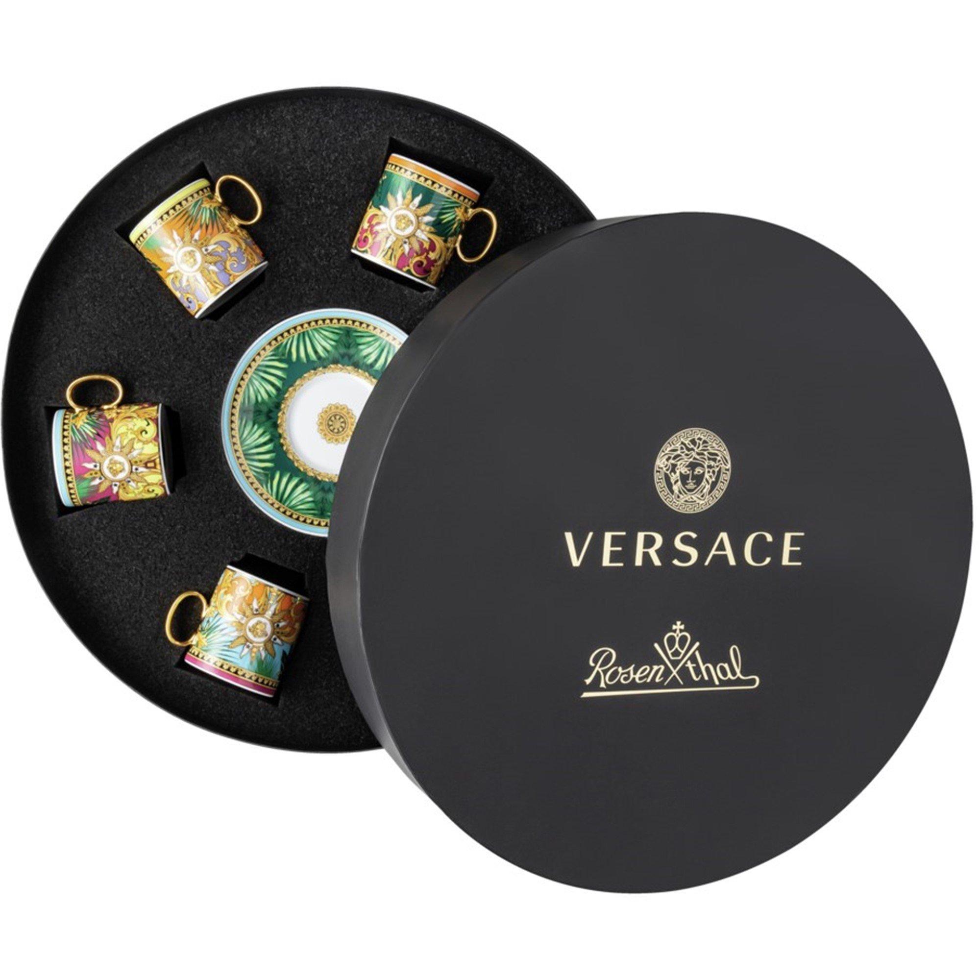 Designed in collaboration with Rosenthal, this set of espresso cups by Versace is imbued with animalier energy. It contains six pieces decorated with a refreshed artwork based on the signature Jungle print and elevated with small Medusa accents. White/multicolour Porcelain 100% All-over graphic print Circular body Single rounded handle to the side Matching saucer Set of six