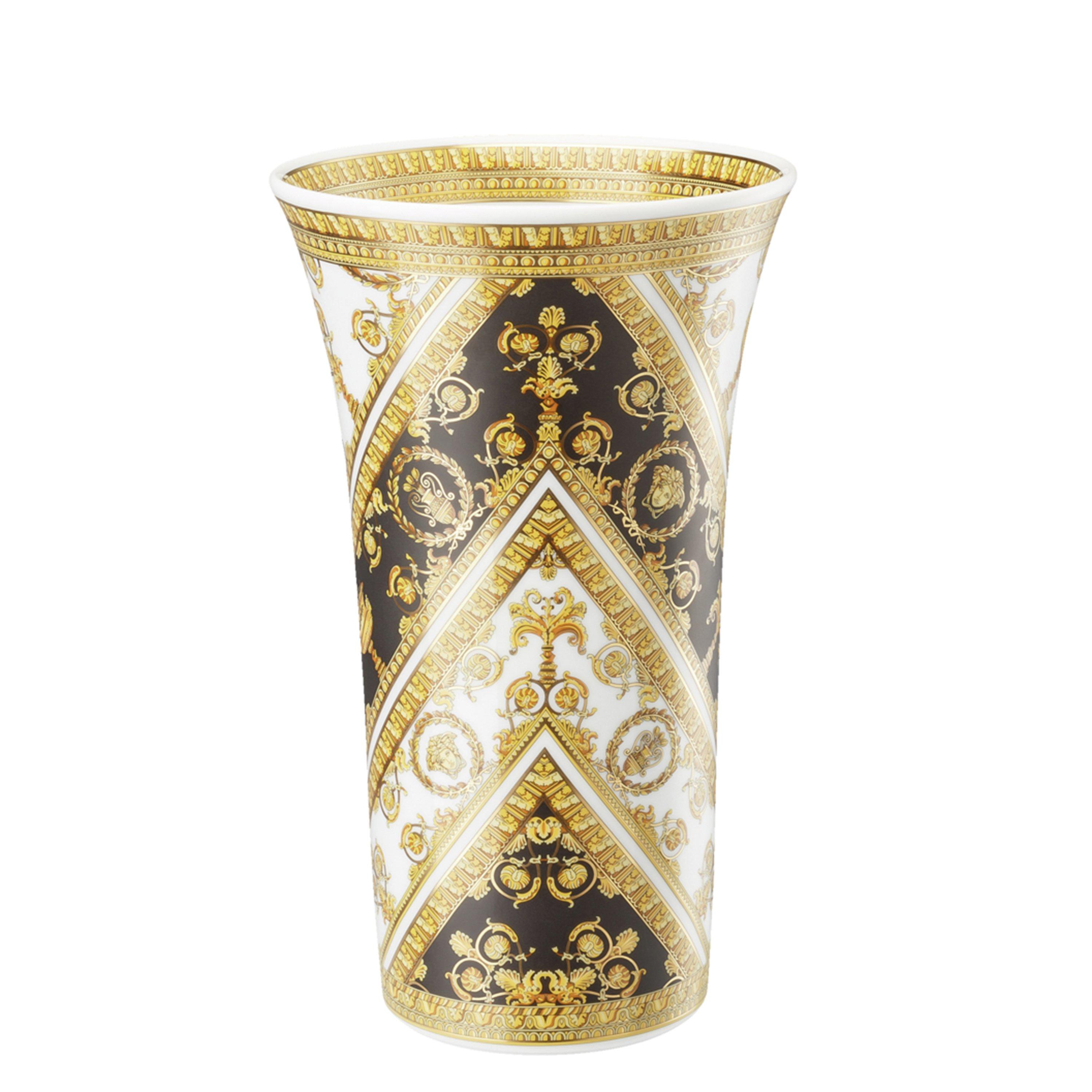 Add an ornate flair to any room with this I Love Baroque vase from Versace. On a fresh white and black background, this vase has a classic flared shape. Crafted from the finest porcelain, it is adorned with a gold coloured Baroque design which is synonymous with the Leading Italian fashion brand and is perfect for creating luxurious floral displays in the home.