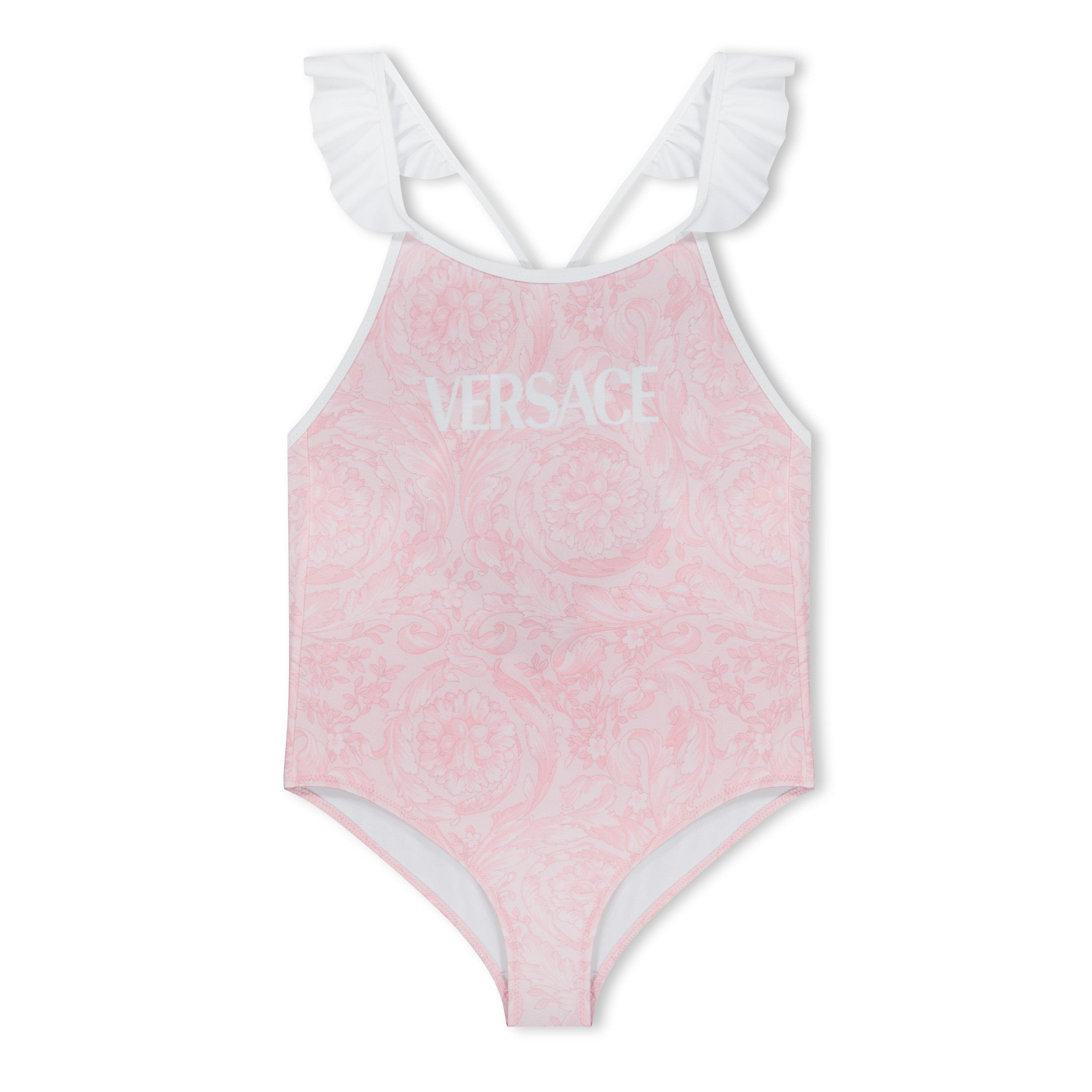 Spoil your child rotten with this Barocco Logo Swimsuit from the incomparable Versace. Famed for its striking designs and unparalleled craftsmanship, the house presents this one-piece swimming costume in high-quality stretch polyester- featuring a round neck with stylish ruffled shoulder straps and a low-cut adjustable X-back. Nylon lining provides all day and comfort, no matter how long she spends in the pool.