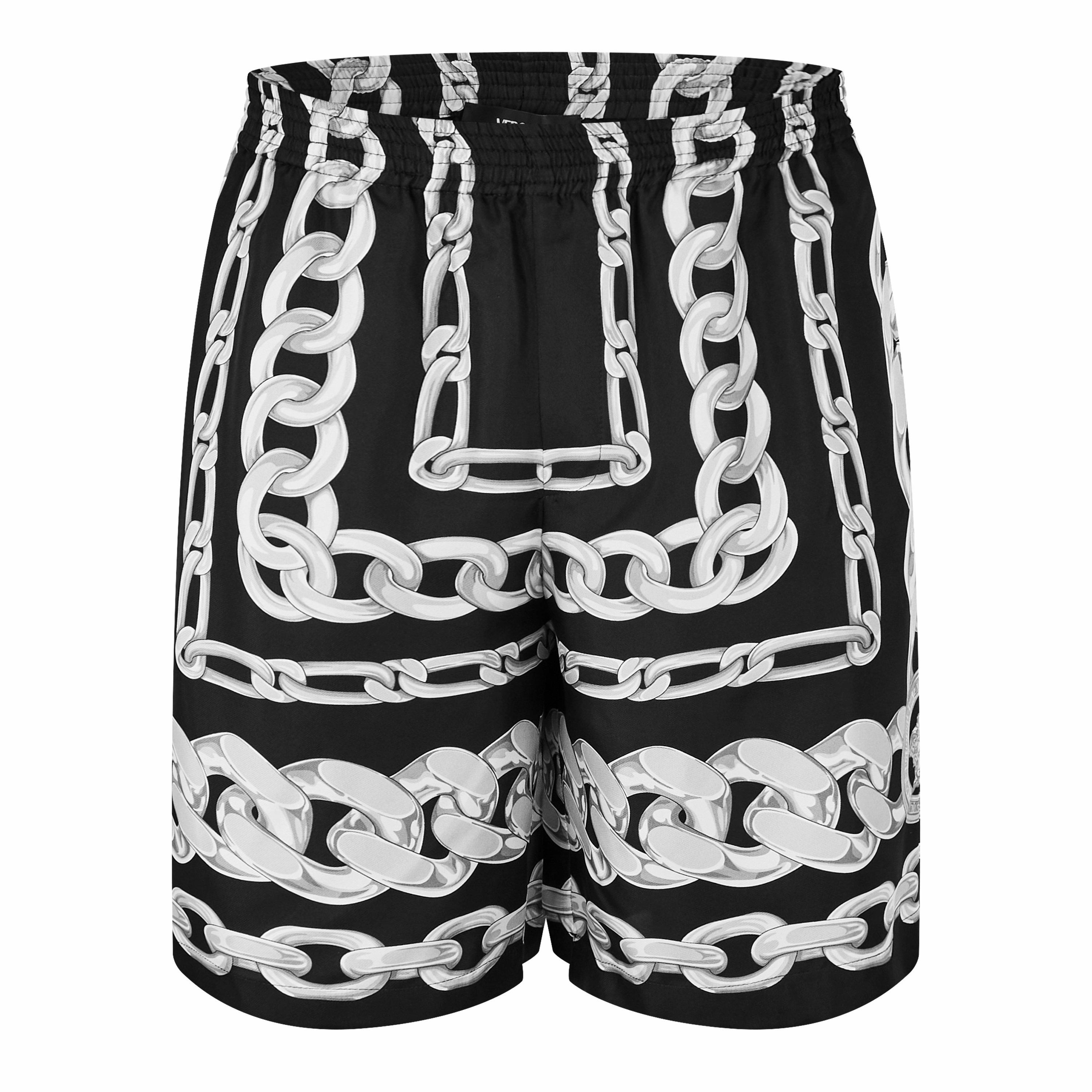 Bold and unmistakably luxurious, the Versace Chain Shorts showcase the house’s iconic chain motif in a striking all-over print. These statement shorts feature an elasticated waistband and refined detailing that blend high fashion with everyday ease. Ideal for summer getaways, rooftop socials, or making a statement at upscale leisure events.