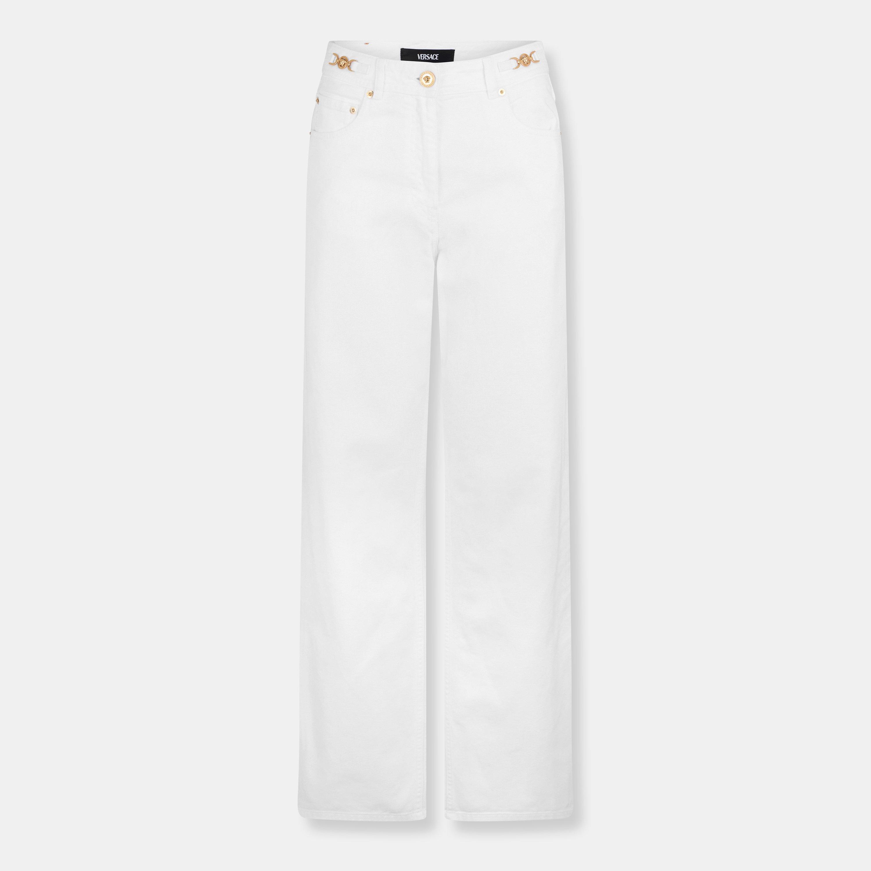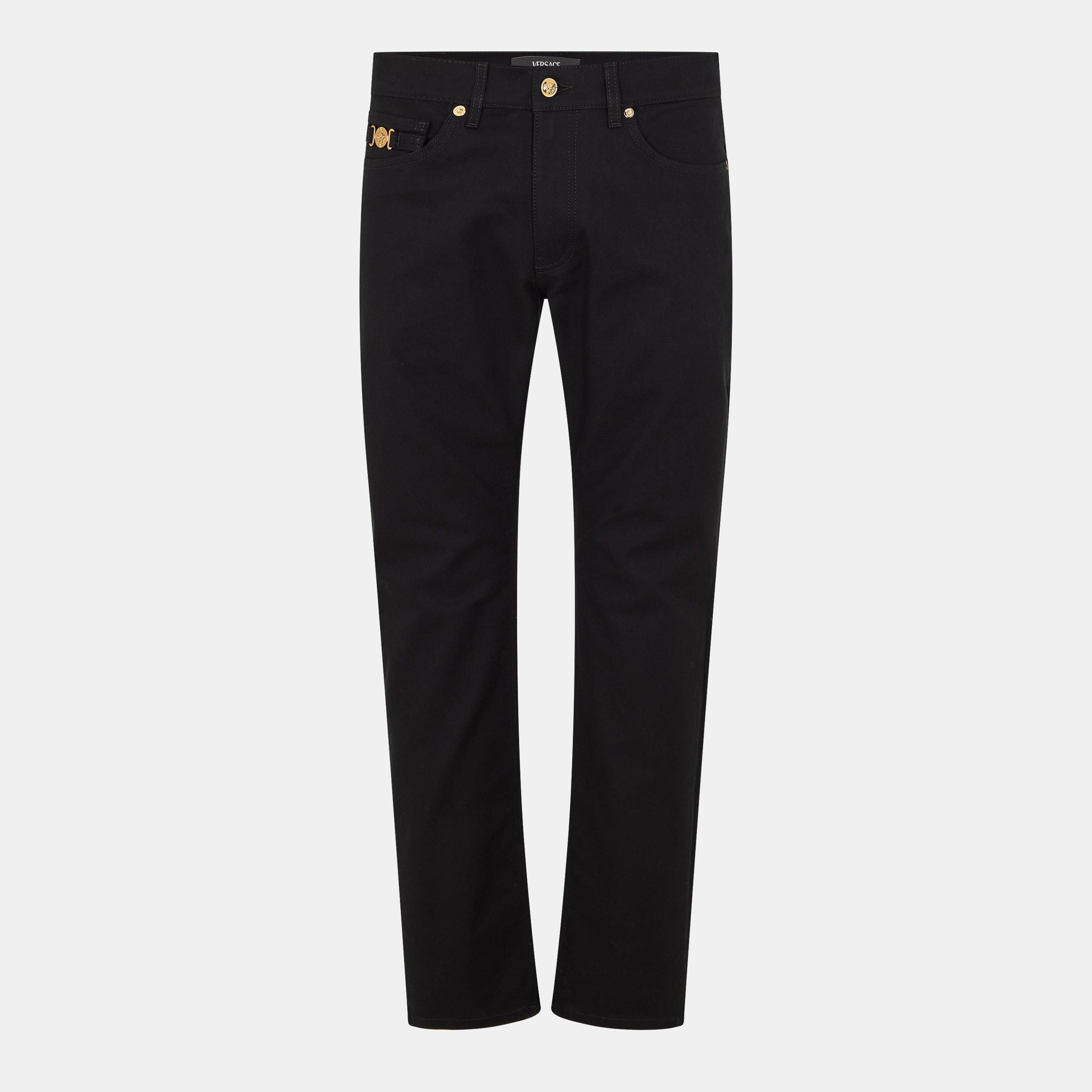 Explore jeans by Versace for denim that goes beyond basics. The collection spans versatile styles, from timeless blue jeans in both slim fit and relaxed cuts to statement-making black Versace jeans that add an edgy touch to any wardrobe. Embrace casual days in light-wash jeans paired effortlessly with a crisp t-shirt and classic white sneakers, perfect for laid-back outings and weekend getaways. For evening affairs or city adventures, opt for dark hues or Versace blue jeans. These pairs make a bold statement when styled with a sleek leather jacket and chunky boots, delivering that signature attitude. Whether you're dressing up for a night out or keeping it cool for a day of errands, these jeans are versatile enough to elevate any look. Let Versace jeans define your style with luxurious comfort and unmistakable Italian flair.
