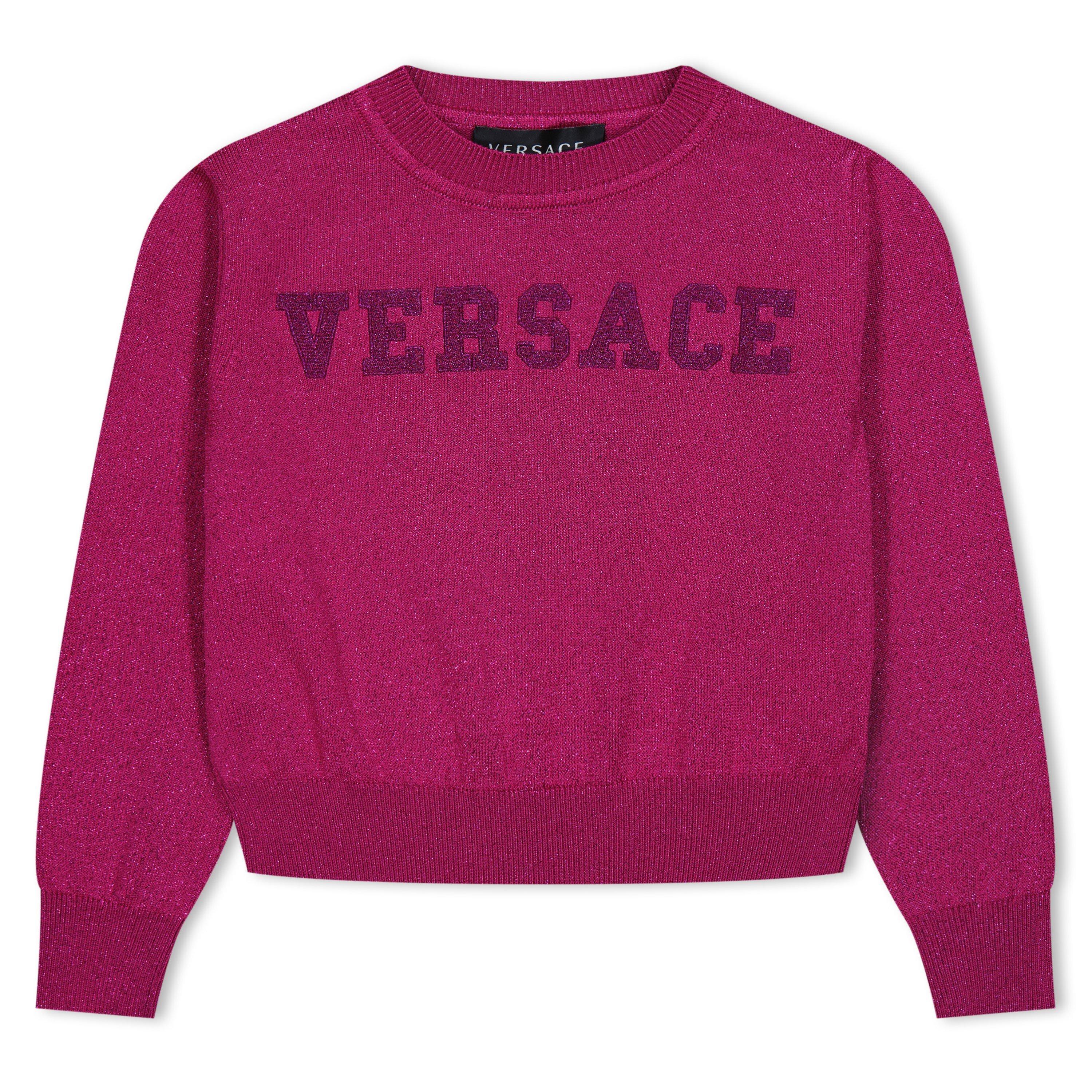 Crafted from a sumptuous acetate blend, this jumper boasts a regular fit and a stylishly short length, ensuring both comfort and grace. The ribbed crew neck detail adds a touch of sophistication, while the long sleeves, complete with ribbed cuffs and trim, exude a sense of refined luxury. The metallic marl design creates a mesmerising visual appeal, perfect for catching admiring glances. Additionally, the front embroidered logo lettering showcases the brand's unmistakable identity, elevating the charm of this jumper to new heights. Ideal for a myriad of occasions, from family gatherings to everyday wear, this versatile piece embodies both practicality and fashion-forwardness. Versace's Logo Knit Jumper for girls is truly a testament to the brand's commitment to providing the utmost in quality and style. Composition: 61% Acetate, 30% Polyamide, 6% Polyester, 3% Elastane. Care: Hand wash only.