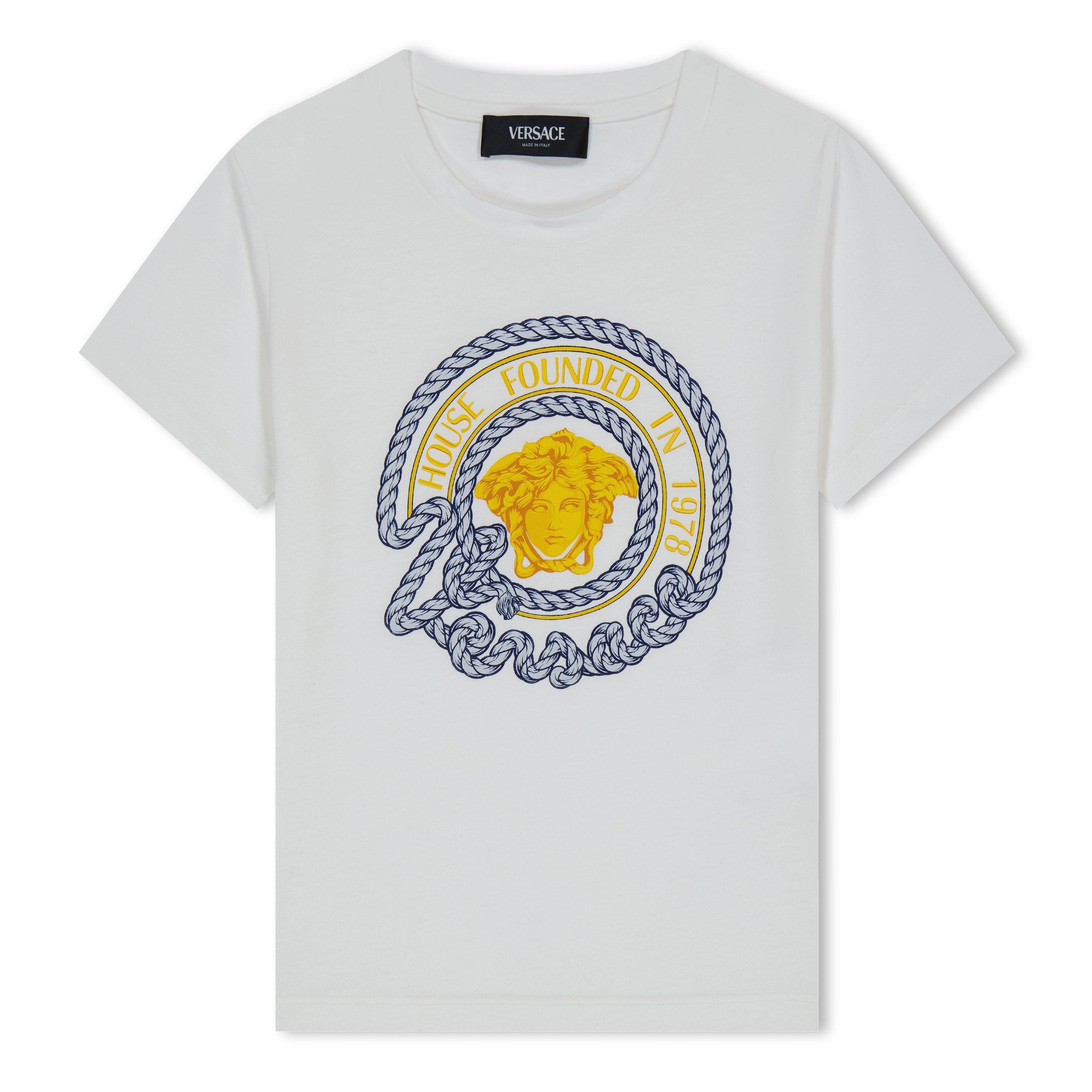 No Versace design is complete without the eye-catching Medusa graphic print, surrounded by a captivating nautical rope emblem. This unique design showcases the brand's iconic Versace logo, symbolising the fusion of fashion and artistry. Whether your child is meeting their friends or relaxing at home, Versace's Nautical Medusa T-Shirt is a must-have addition to their collection.