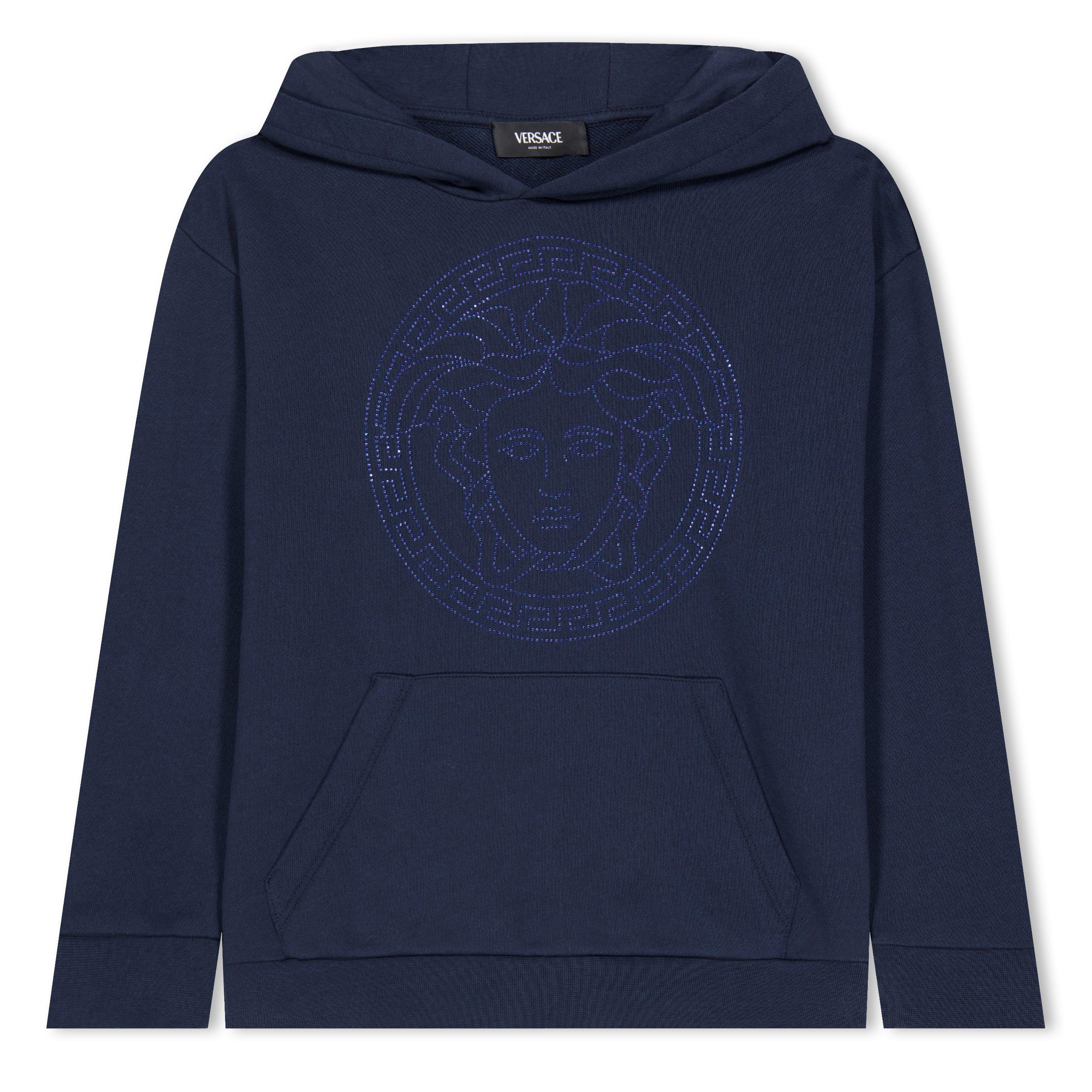 Elevate your youngster's staple pieces with Versace's Rhinestone-embellished Hoodie, a brand synonymous with bold luxury and Italian craftsmanship. Embellished with the signature logo motif in rhinestones, exuding a designer stamp. From outings with friends to simply lounging at home, this pullover is perfect for your young one.