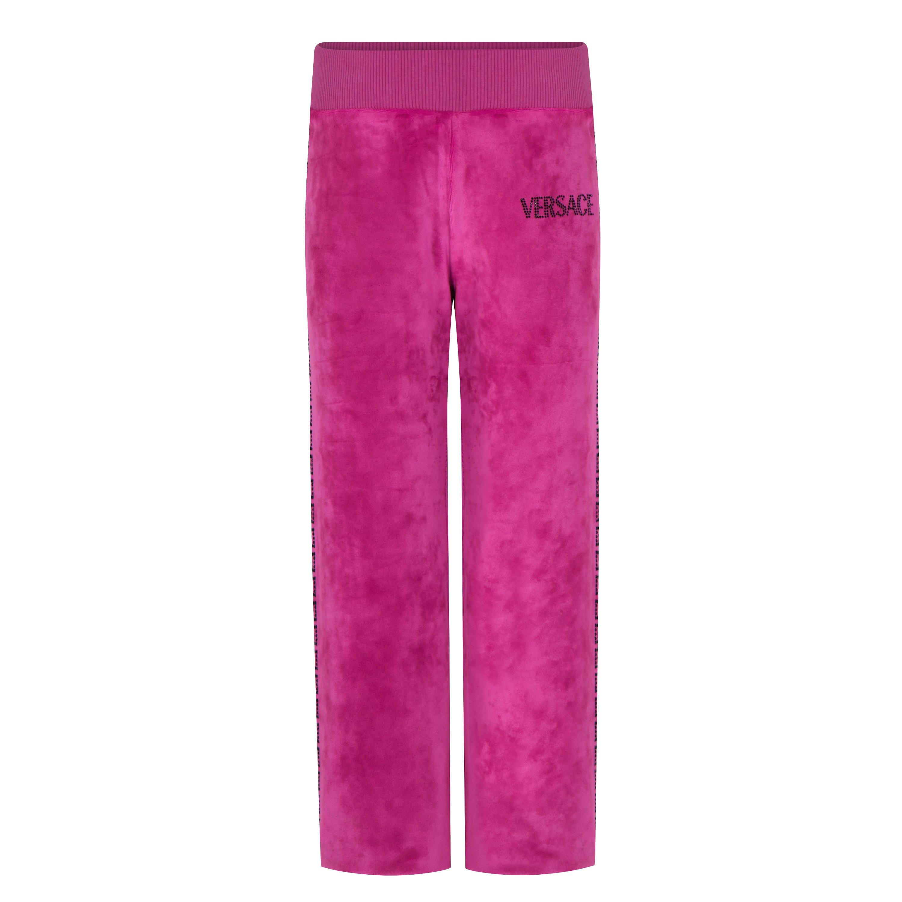 Now approaching its golden anniversary, Versace has become known for setting the benchmark for high-end apparel. They are known for their signature style that fuses maximalism, opulence and irreverent pop culture references. With this strikingly flamboyant design, the label has become a symbol of individuality, self-expression and confidence. From Dua Lipa to Taylor Swift, it has accumulated an impressive following, becoming one of the most recognisable brands on the planet. These La Greca Crystal Jogging Bottoms are the perfect example of the house's captivating spirit and make the ideal addition to your little lady's after-school collection. Expertly crafted in soft and stretchy velour, this eye-catching pair boasts an elasticated waistband that frames straight legs and straight hems. The bold block colouring will ensure that this pair will be at the heart of any weekend ensemble, and no Versace design is complete without its signature La Greca trim, rendered here in arresting crystals. Finally, its iconic logo on the left leg ensures immediate brand recognition and luxury allure. Base composition: 92% polyester, 8% elastane; Embroidery: 95% elastane, 5% elastane; Embellishments: 100% glass. Hand wash only: Please refer to and follow garment labelling for precise care instructions.