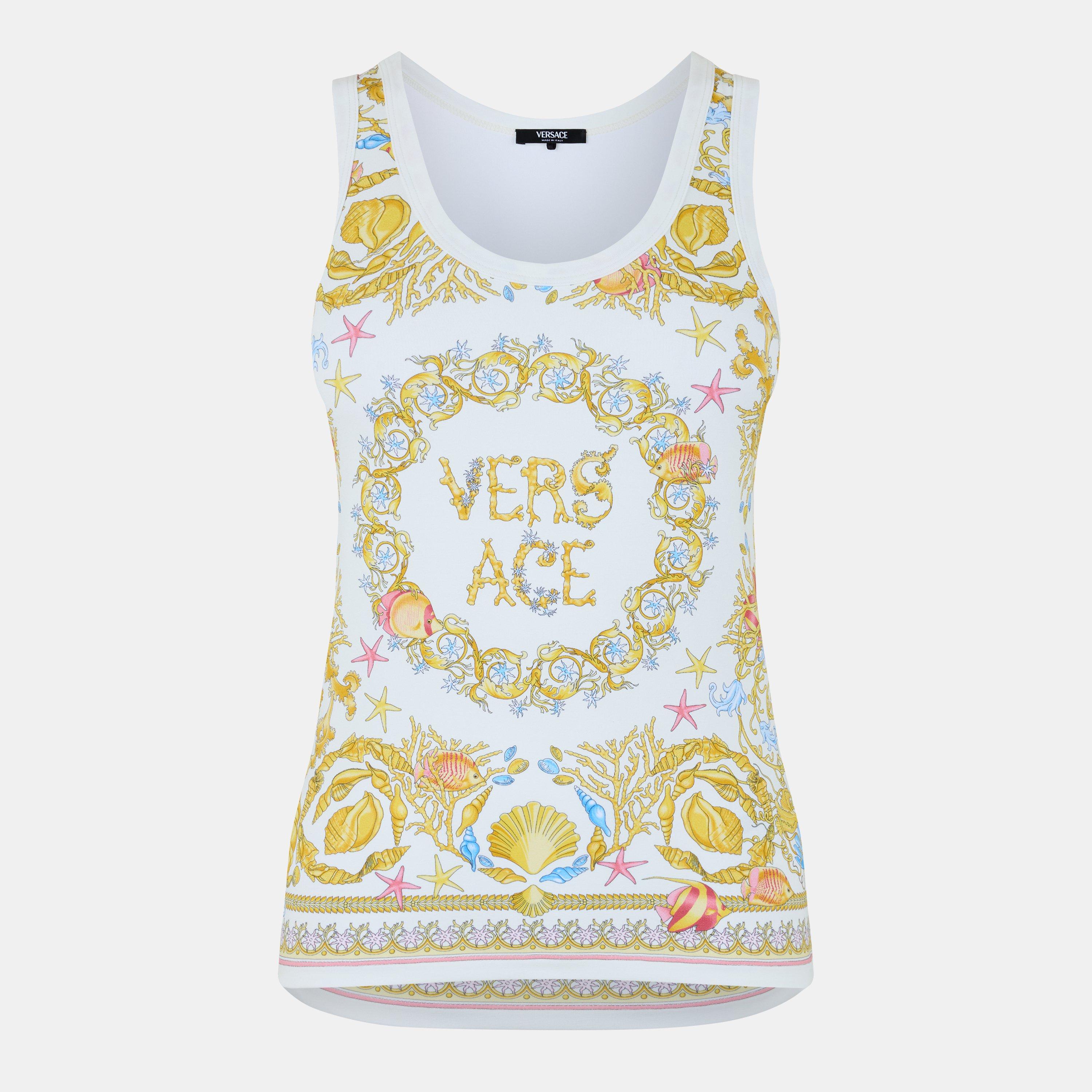 The Versace Barocco Printed Sleeveless Tank Vest features the house's baroque print throughout. The design maintains a streamlined profile for easy styling.