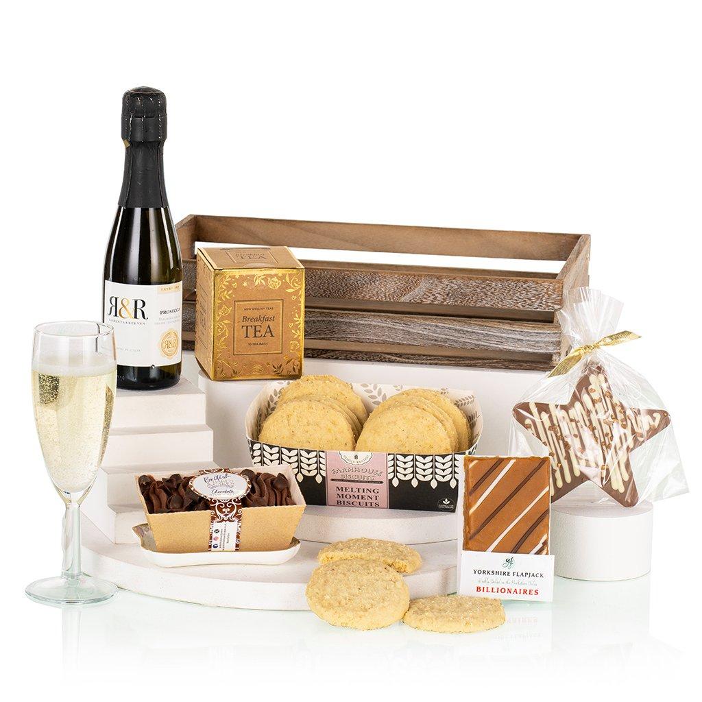 Celebrate a new home in style with our New Home Luxury Gift Crate, thoughtfully curated to delight new homeowners. Presented in a charming small wooden crate, this gourmet hamper combines indulgent sweets, fine tea, and sparkling prosecco, the perfect way to congratulate someone on their move or mark a housewarming occasion. Inside, recipients will enjoy a selection of luxurious treats including buttery Farmhouse Biscuits Melting Moments, a rich British Bakes & Cakes Chocolate Mini Loaf Cake, and a decadent Yorkshire Flapjack Billionaires Slice. A Stas Chocolatier Milk Chocolate Star with White Chocolate Drizzle & Gold Sprinkles adds an elegant flourish, while New English Teas English Breakfast Tea provides a comforting pause. To toast the occasion, the hamper includes a bottle of R&R Robert & Reeves Prosecco, creating a thoughtful, celebratory gift that combines gourmet indulgence with stylish presentation. perfect for welcoming someone to their new home. Contents: British Bakes & Cakes Chocolate Mini Loaf Cake 90g Farmhouse Biscuits Melting Moments 200g New English Teas English Breakfast Tea 10 Teabags 20g Stas Chocolatier Decorated Milk Chocolate Star 50g Yorkshire Flapjack Billionaires Slice 85g Prosecco R&R Robert & Reeves Italy 20cl 10.5% vol Wooden Crate