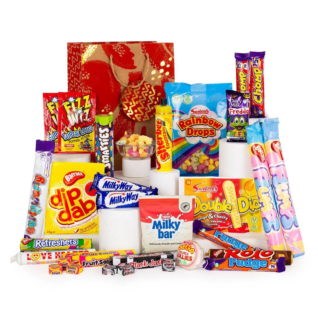 Packed with classic sweets and chocolates, Tear & Share is a nostalgic gift bag bursting with favourites like Curlywurly, Freddo, Smarties, Rolos, Love Hearts and more. A fun, colourful gift for birthdays, offices or sweet-toothed celebrations. Contents: Barrat Black Jacks 36g Barrat Fruit Salad 36g Barratt Dip Dab 23g Barratt Flumps 20g x 2 Barratt Refreshers 34g Barratt Sherbet Fountain 25g Cadbury Chomp Bar 23.5g x 2 Cadbury Curlywurly 21.5g Cadbury Freddo Milk Chocolate 18g Cadbury Fudge 22g x 2 Fizz Wiz Super Loud Strawberry Flavour Popping Candy x 2 Mars Milky Way 21.5g x 2 Nestle Milkybar Buttons 30g Nestle Rolos 52g Nestle Smarties 38g Swizzels Giant Love Hearts 39g Swizzels Matlow Double Dip 19g Swizzels Matlow Mega Double Lollies 32g Swizzels Matlow Rainbow Drops 32g Gift Bag