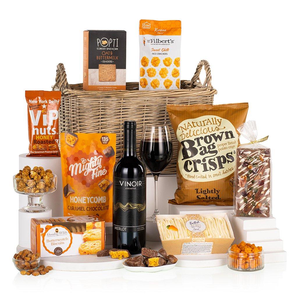 Elegant and indulgent, The Luxury is a show-stopping hamper filled with fine food and wine. Featuring Vinoir Merlot, savoury nibbles, biscuits, cake, chocolate and honeycomb, it's beautifully presented in a greywash willow basket, the perfect gift for any special occasion. Contents: British Bakes & Cakes Carrot Loaf Cake 290g Brown Bag Crisps Lightly Salted Crisps 150g Grandma Wild's Butterscotch Biscuits 150g Mighty Fine Salted Caramel Honeycomb Dips 90g Mr Filbert's Sweet Chilli Rice Crackers 40g New York Delhi ViP Nuts Honey Roasted Peanuts 63g Popti Cornish Bakehouse Oat & Buttermilk Crackers 120g Stas Chocolatier Decorated Milk Chocolate Bar 100g Merlot Vinoir Chile 75cl 12.5% vol Willow Basket