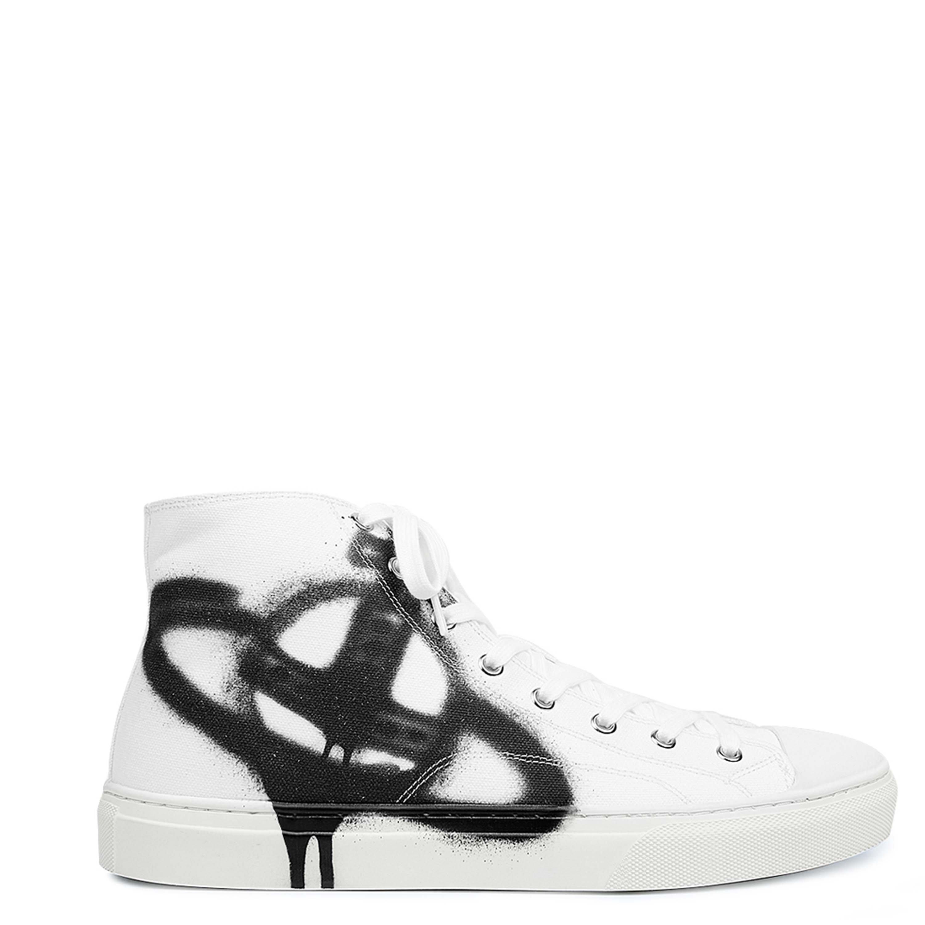 Incorporate Vivienne Westwood's rebellious edge into your sneaker collection with their Plimsoll High Top Trainers. Responsibly crafted with a GRS-certified recycled polyester canvas and grounded with a resilient recycled rubber sole, these high-tops features a full lace-up fastening and a rounded toe for a classic look. Designed in a solid colour block, a graffiti print of the British brand's signature Orb motif embellishes the outer sides and an official logo badge is woven onto the tongue for unmissable designer recognition. Sold with protective dust bag.