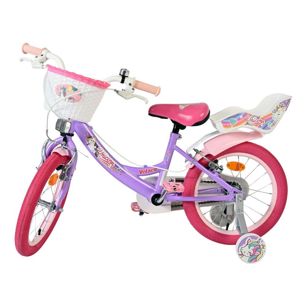 The Volare Unicorn 16-inch children's bike is a true dream bike for kids who love colour, imagination, and cheerful unicorn details. The playful purple look, combined with rainbow accents and a charming design, makes every ride special. The bike is equipped with two hand brakes (no coaster brakes), so children immediately learn to brake like they would on a full-sized bike. The fully enclosed chain guard provides extra protection while cycling. Thanks to the height-adjustable saddle and handlebars, the bike easily grows with your child. With the removable training wheels, children can learn to ride safely and confidently. The pink tires give the bike a striking and stylish look. There's a handy basket on the front and a doll seat on the back, perfect for carrying toys or a favourite doll. For visibility, the bike is equipped with reflectors on the front, back, and wheels, and of course, a bell completes the look. The Volare Unicorn 16 inch is a magical and safe children's bike that turns every ride into a fun adventure.