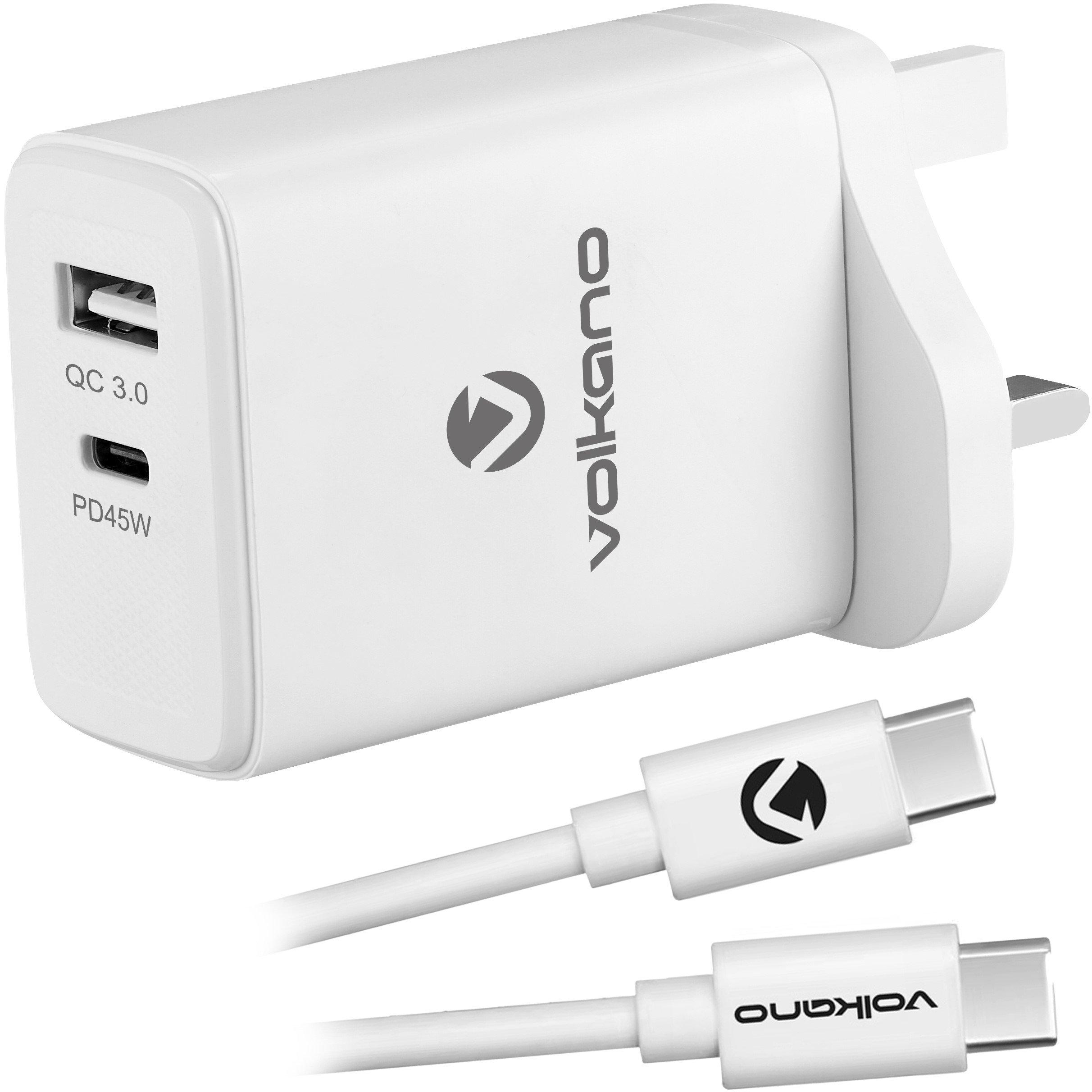 The Volkano 45W GaN PD & QC Dual USB port wall charger is an innovative charging solution designed to meet the demands of modern technology users. Featuring one Power Delivery (PD) USB-C port and one Quick Charge (QC) USB-A port, this charger provides a maximum output power of 45W, ensuring rapid and efficient charging for a variety of devices. Whether you need to power up your laptop or charge your mobile phone, this versatile charger is compatible with any device that requires a 45W USB-C charger, making it an essential accessory for both home and travel use. The compact design, enhanced by Gallium Nitride (GaN) technology, allows for a smaller footprint without compromising on performance, making it easy to carry in a bag or keep on a desk.