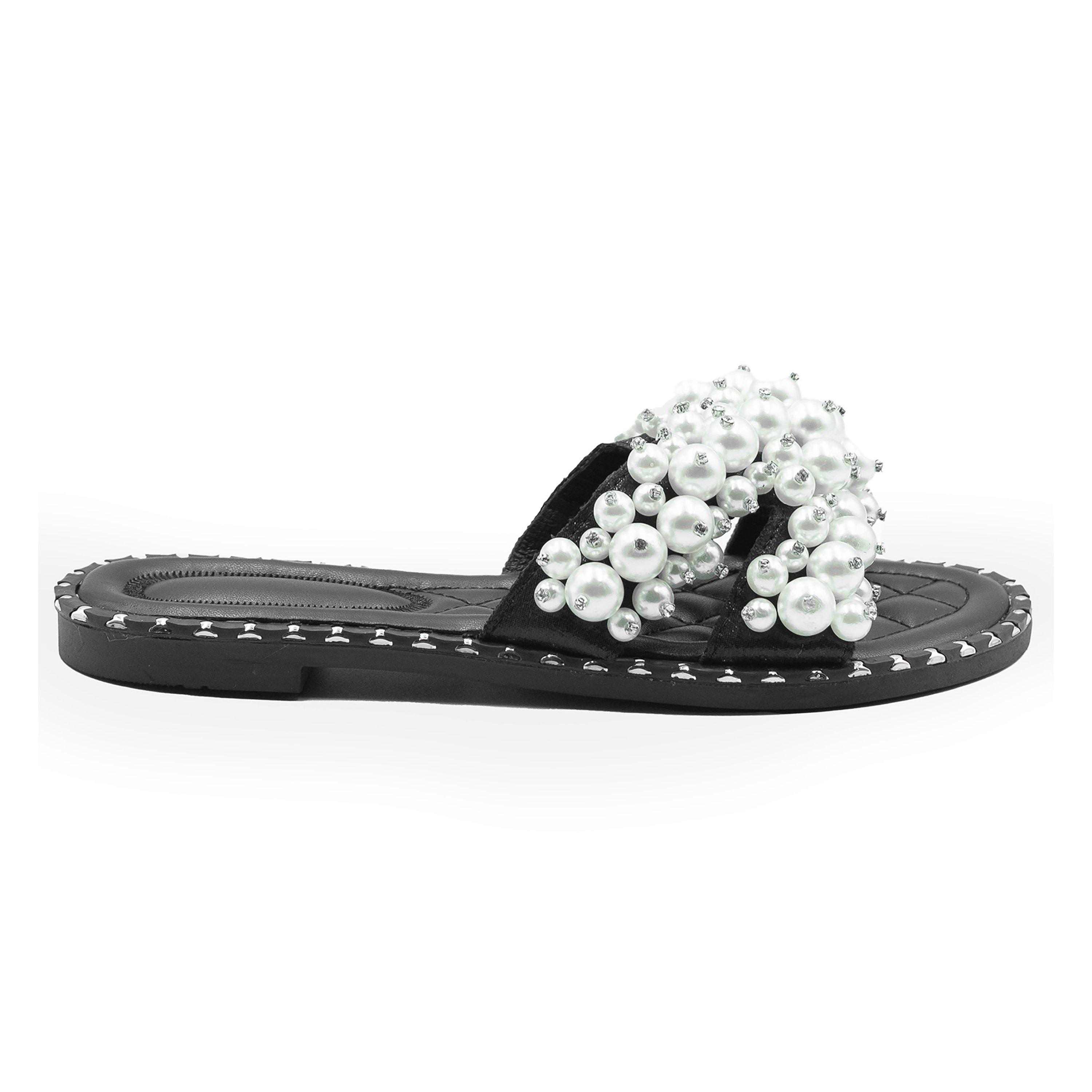 Step out in style and elegance with our Eve Pearl Embellished Flat Slider Sandals. These sliders are designed to offer both versatility and luxury, the perfect addition to your collection of footwear. ,Key Features: