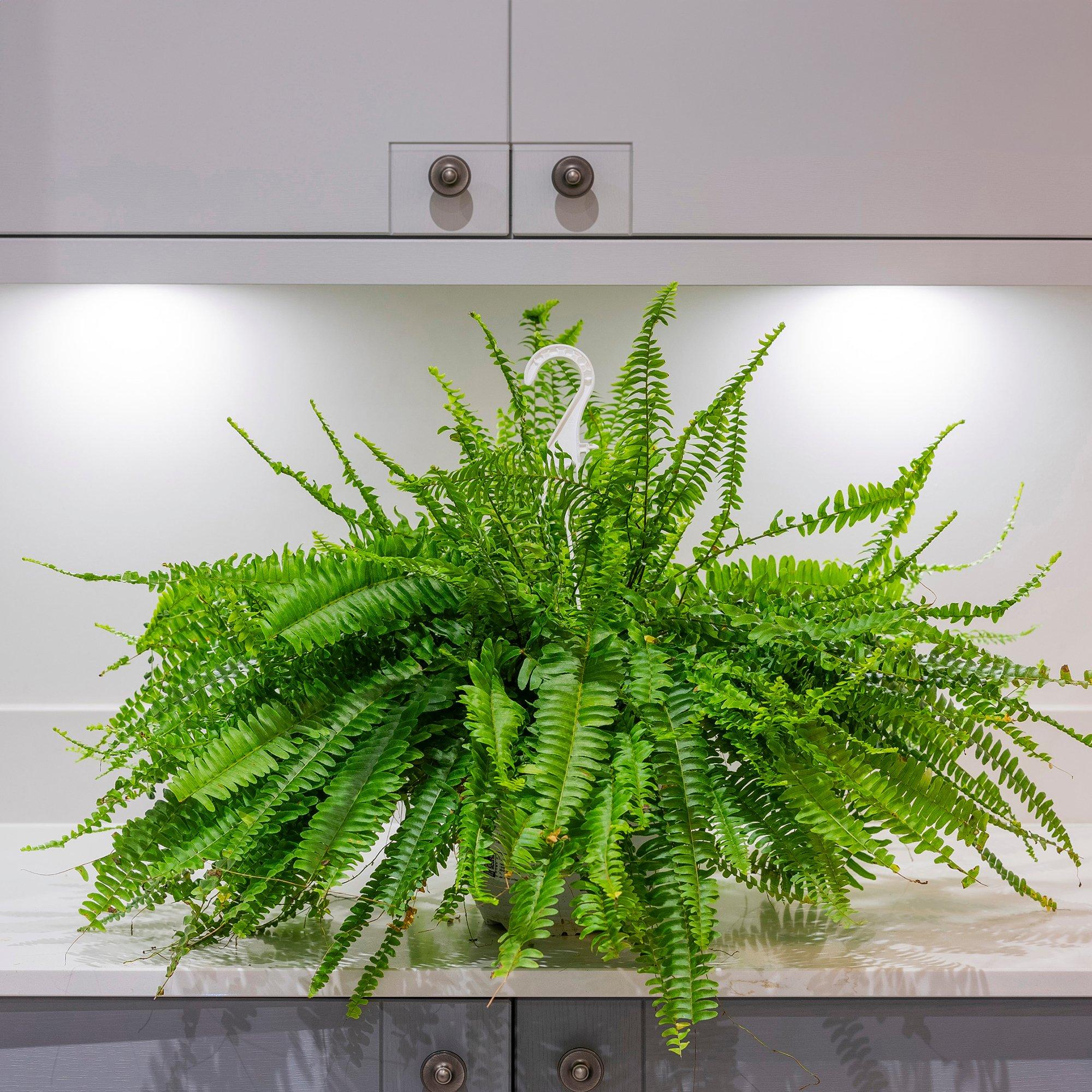 One of the most well-known indoor plants, Nephrolepis exaltata, known more commonly as the sword fern or Boston fern, is an evergreen, perennial houseplant with arching fronds of delicate green. 'Sonata' is a popular variety and is perfect to give as a gift or a housewarming present, and looks spectacular in a hanging basket or pot where it can cascade over the edges. This favourite of Victorian plant hunters will keep the air inside your home clean, removing toxins such as formaldehyde and benzene, and giving out valuable oxygen at night. Easy to grow and look after, your Boston Fern loves a humid atmosphere so is perfect for a bathroom or kitchen where it will thrive in a shady part of a brightly lit room. Supplied as an established 50-60cm plant in a 19cm hanging pot. Please note: This product cannot be delivered to Northern Ireland.
