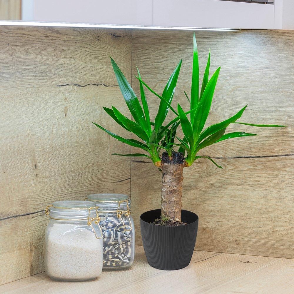Supplied as a nursery potted single-stem Yucca with trunk and foliage measuring 45cm above the pot, plus a 14cm black pot cover.